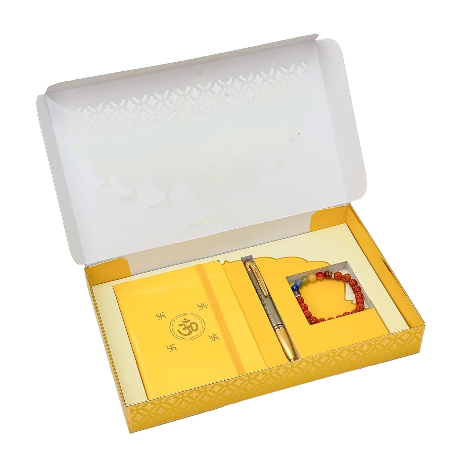 Submarine Ball Pen Gift Set – This set includes a Rudraksh-studded ball pen, an A6-sized premium diary, and a 7 chakra bracelet. This set combines practical functionality with symbolic elements.