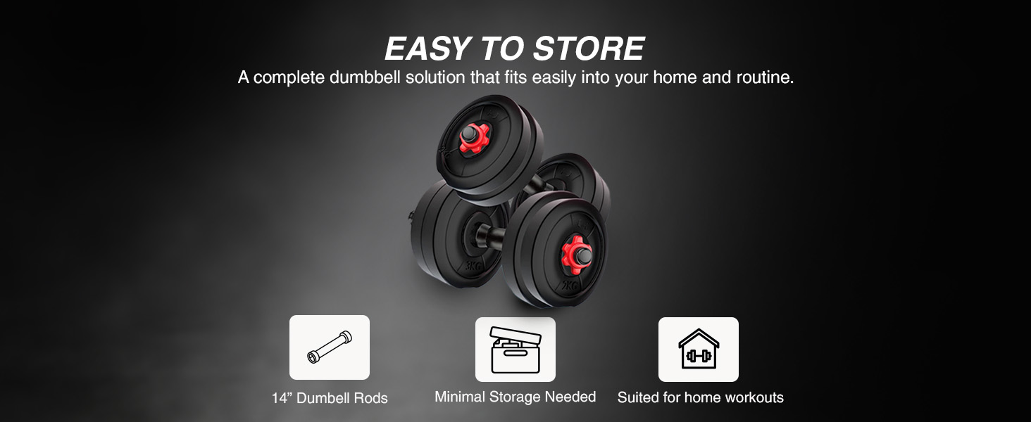 In-box Contents: In-Box Contents: 20 kg of PVC weight (3 kg x 4 = 12 kg, 2 kg x 4 = 8 kg), 2 x 14 inch dumbbell rods with nuts