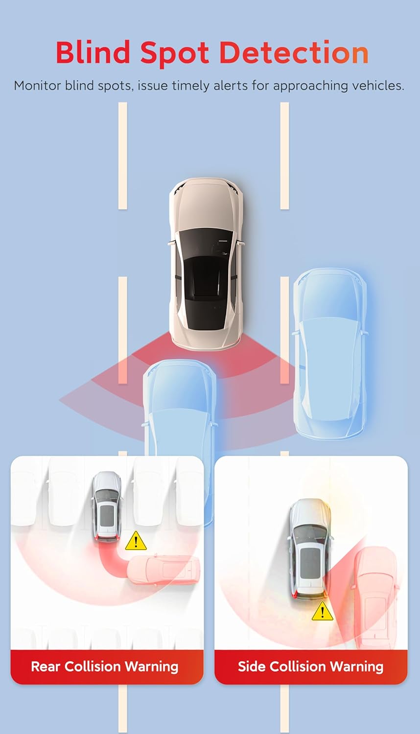 Enhanced BSD Algorithm – The Carlizem G1 elevates safety with its advanced Blind Spot Detection. It keeps a constant watch on adjacent lanes, alerts you to vehicles rapidly approaching from behind, and helps prevent side or rear collisions. The rear unit also functions as a clear, reliable reverse parking camera, improving visibility in tight spaces. With full front and rear coverage, the Carlizem G1 delivers smarter awareness and safer driving every day.