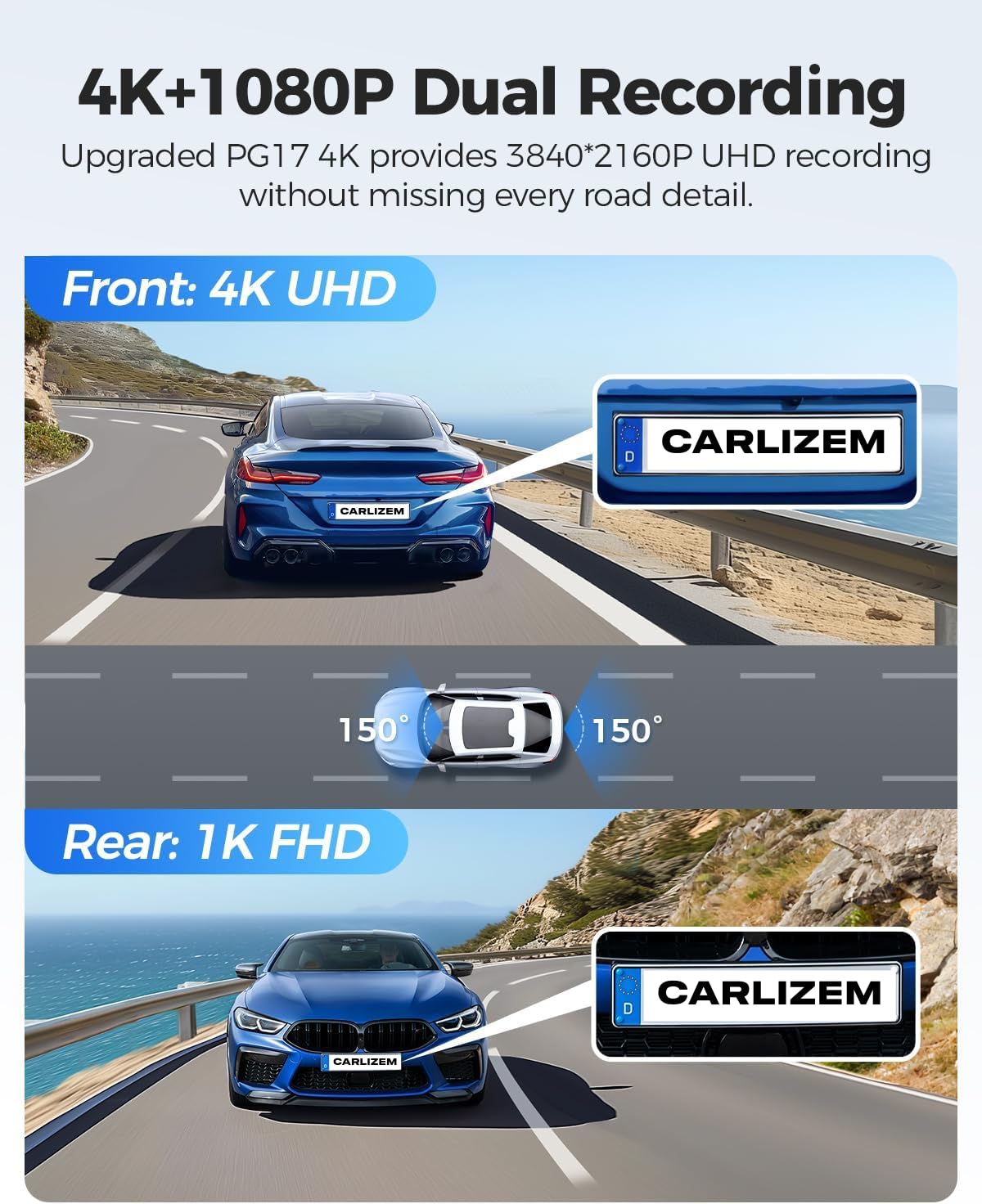 4K Dual-Channel Stravis Sensor – The Carlizem G1 captures ultra-sharp footage with a 2560×1440p front camera (30fps) and a 1080p rear camera (25fps), ensuring every detail is recorded from both angles. Its full IPS touch display provides smooth, intuitive control, while WDR/HDR image processing and wide-angle lenses deliver clear, balanced video in harsh sunlight, deep shadows, and nighttime conditions.The high-quality 7-glass lens setup captures vivid road details, making it one of the best dash cameras for night-time driving and parking surveillance.