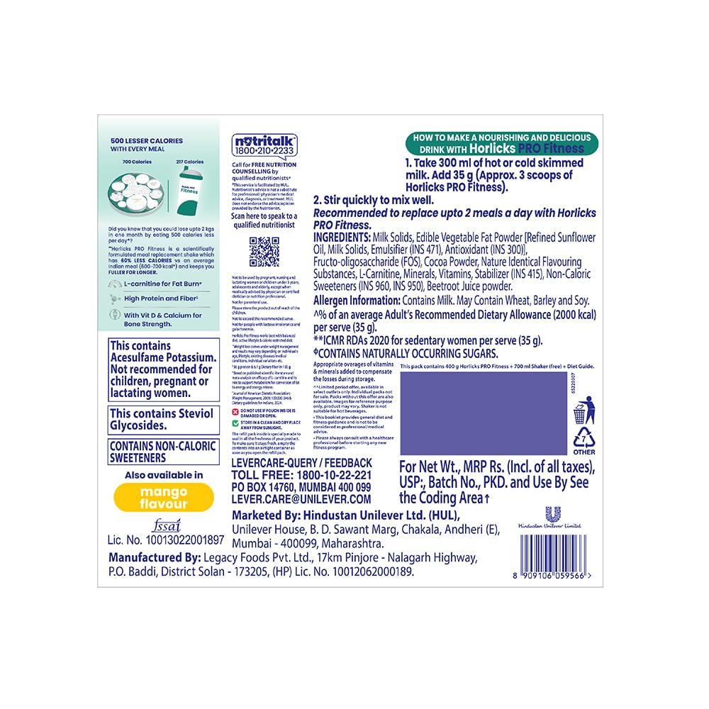 Did you know that you could lose up to 2 kgs in one month by eating 500 calories less per day? Horlicks Pro Fitness is a scientifically formulated meal replacement shake which has 60% LESS CALORIES vs compared to an avg Indian meal (600-700kcal) and keeps you FULLER FOR LONGER. L-carnitine for Fat Burn, High Protein and Fiber, With Vit D & Calcium for Bone Strength. Horlicks Pro Fitness is available in 2 tasty Flavors, Mango & Chocolate. Get your Free Shaker and Booklet with every pack. Your wellness guide includes smart tips for weight loss, Easy and delicious recipes, Personal weight tracker & Physical activity planner. Ready in 3 easy Steps, take 300ml of Hot/Cold skimmed Milk, add 35g of Horlicks Pro Fitness, Mix & enjoy. Three Steps to a Fitter Lifestyle, Shake it up, replace up to 2 meals with Horlicks Pro Fitness, add regular exercise to boost energy, Balance your diet with nutrition rich foods. You are not alone in this weight loss journey; you are one call away to talk with India’s certified nutritionists. Call 1800 210 2233 Mon-Sat 10am to 6pm.Horlicks Pro Fitness is a scientifically formulated meal replacement shake which has 60% LESS CALORIES vs compared to an Avg Indian meal (600-700kcal) and keeps you FULLER FOR LONGER.