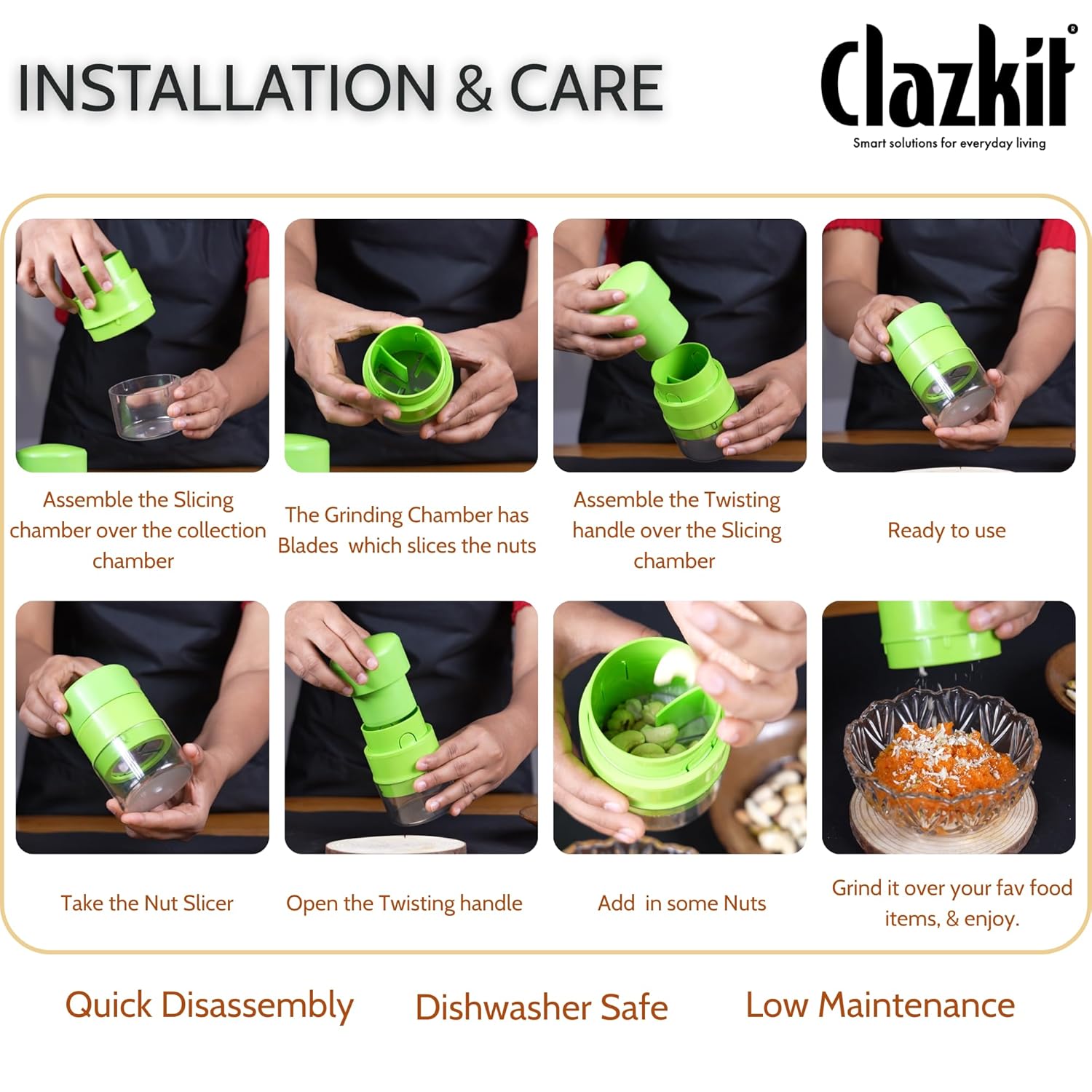 Innovative Space-Saving Design:** Free up valuable countertop space with Clazkit’s innovative kitchen gadget. The Dry Fruits Slicer comes with a container to store dry fruits, preventing slippage during slicing. This design ensures a clean, safe, and efficient slicing experience, eliminating the hassles of washing and wiping.