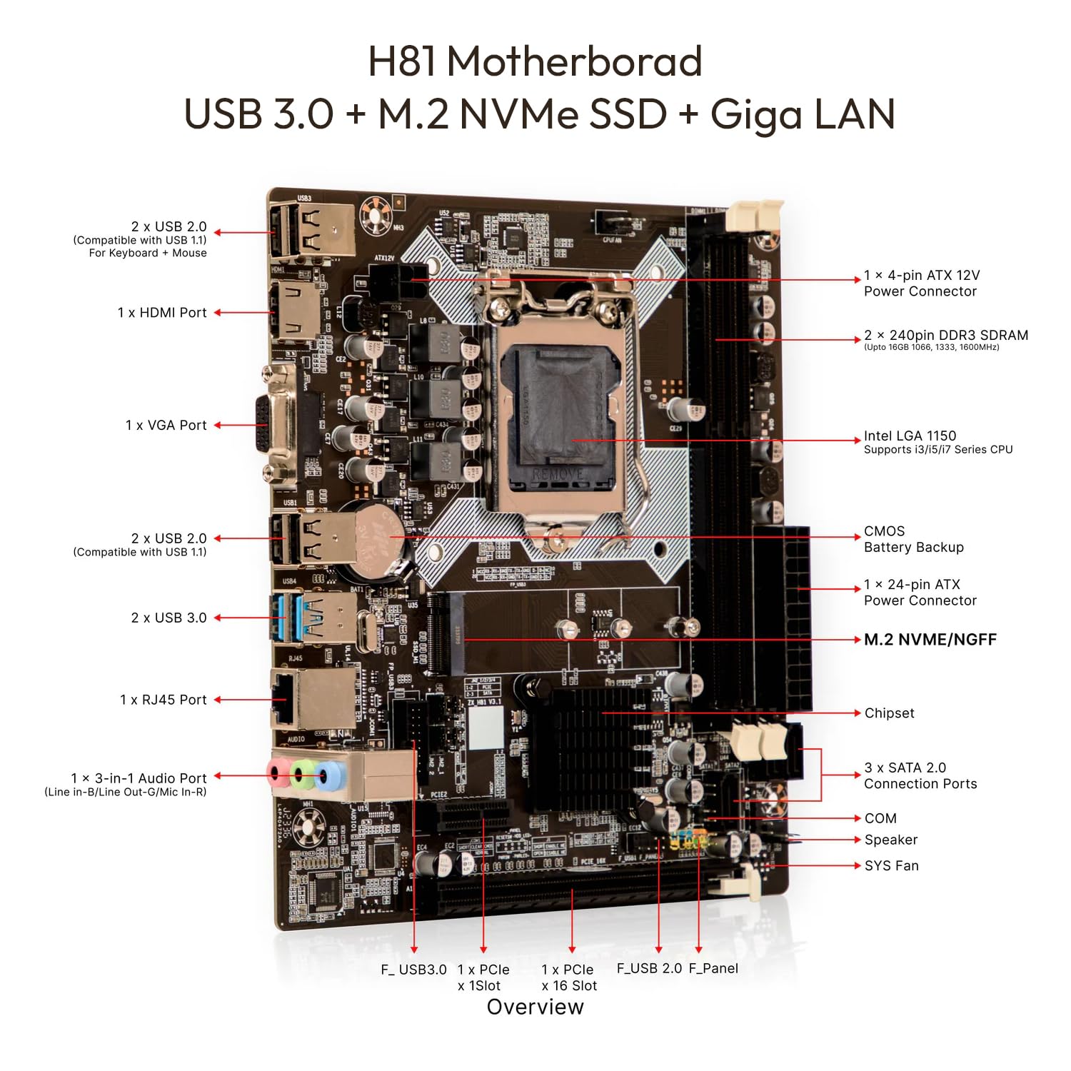 Onborad Features : 4× SATA II ports, PCI Express x16 slot, and dedicated NVMe slot, making it easy to upgrade with additional storage or a dedicated graphics card.