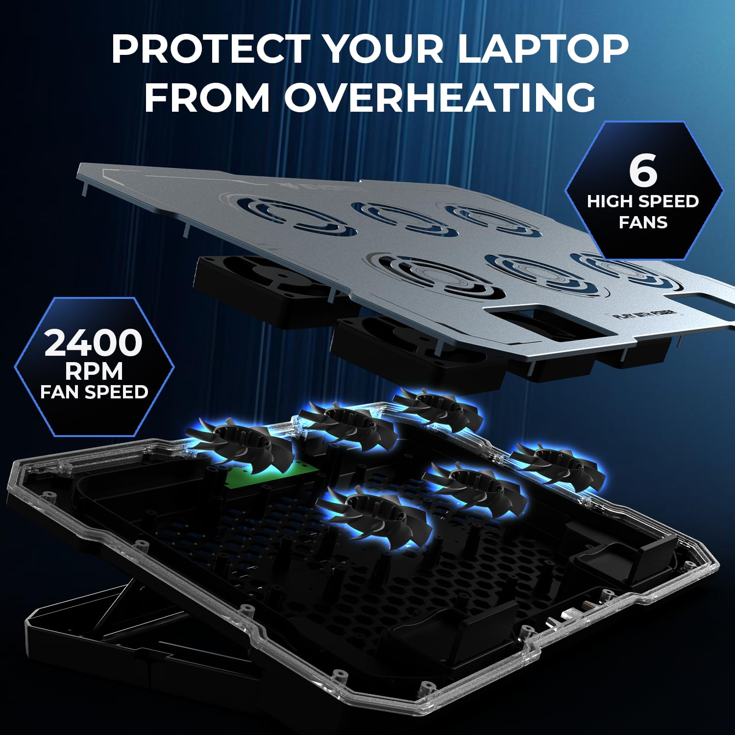 𝗣𝗼𝘄𝗲𝗿𝗳𝘂𝗹 𝟲-𝗙𝗮𝗻 𝗖𝗼𝗼𝗹𝗶𝗻𝗴 𝗣𝗲𝗿𝗳𝗼𝗿𝗺𝗮𝗻𝗰𝗲: Experience exceptional heat dissipation with six 2400 RPM fans delivering up to 65 CFM airflow. This laptop cooling pad keeps your gaming laptop cool even under heavy load, ensuring smoother gameplay and longer device life.