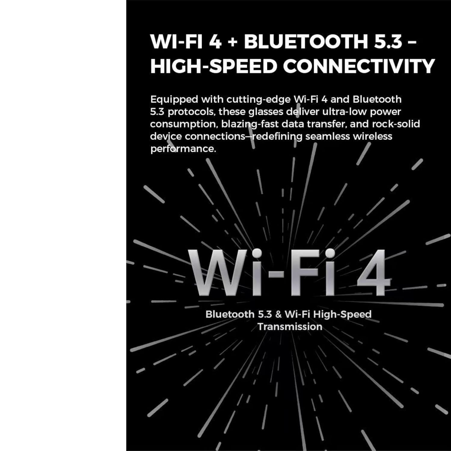 WI‑FI + BLUETOOTH– High Speed Connectivity Equipped with cutting-edge Wi‑Fi and Bluetooth protocols, these glasses deliver ultra-low power consumption, blazing-fast data transfer, and rock-solid device connections—redefining seamless wireless performance. Connectivity Highlights: Wi‑Fi High-Speed Transmission Bluetooth Stable & Fast Connectivity