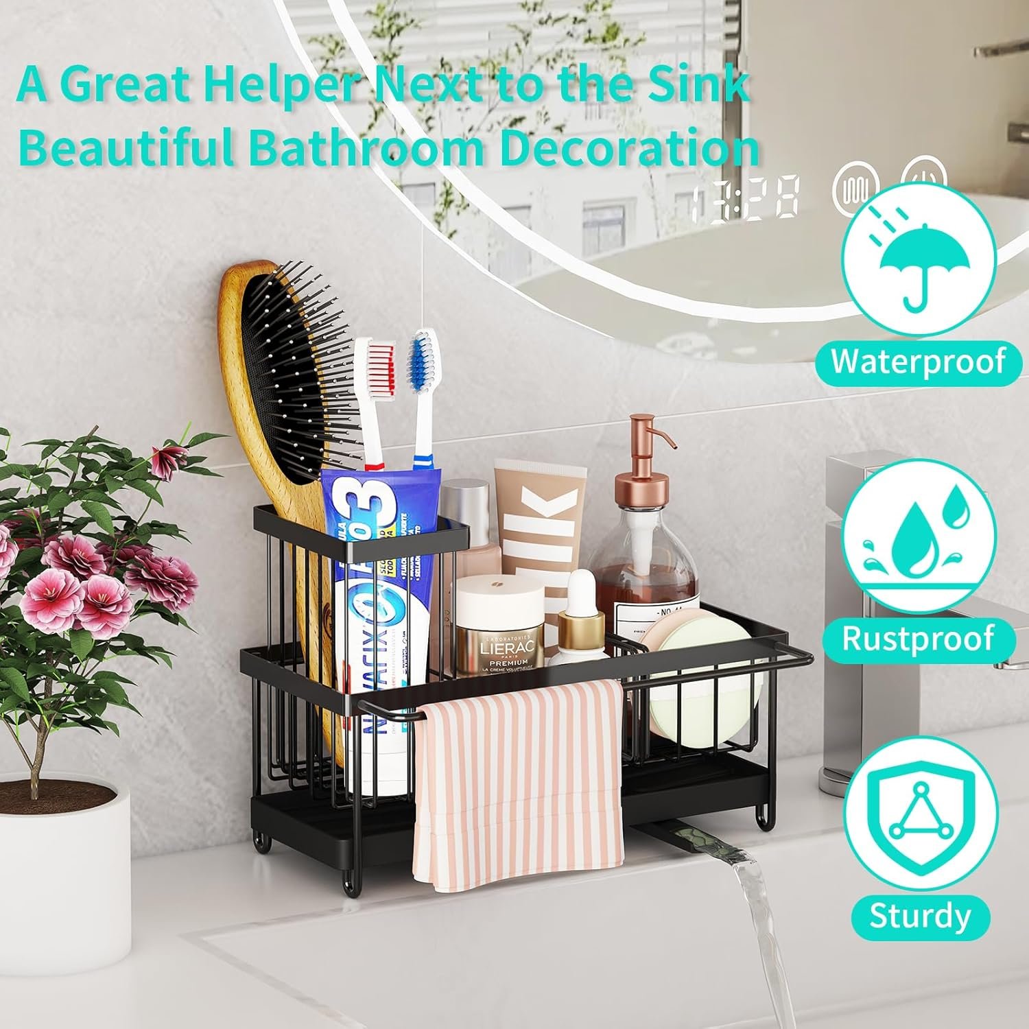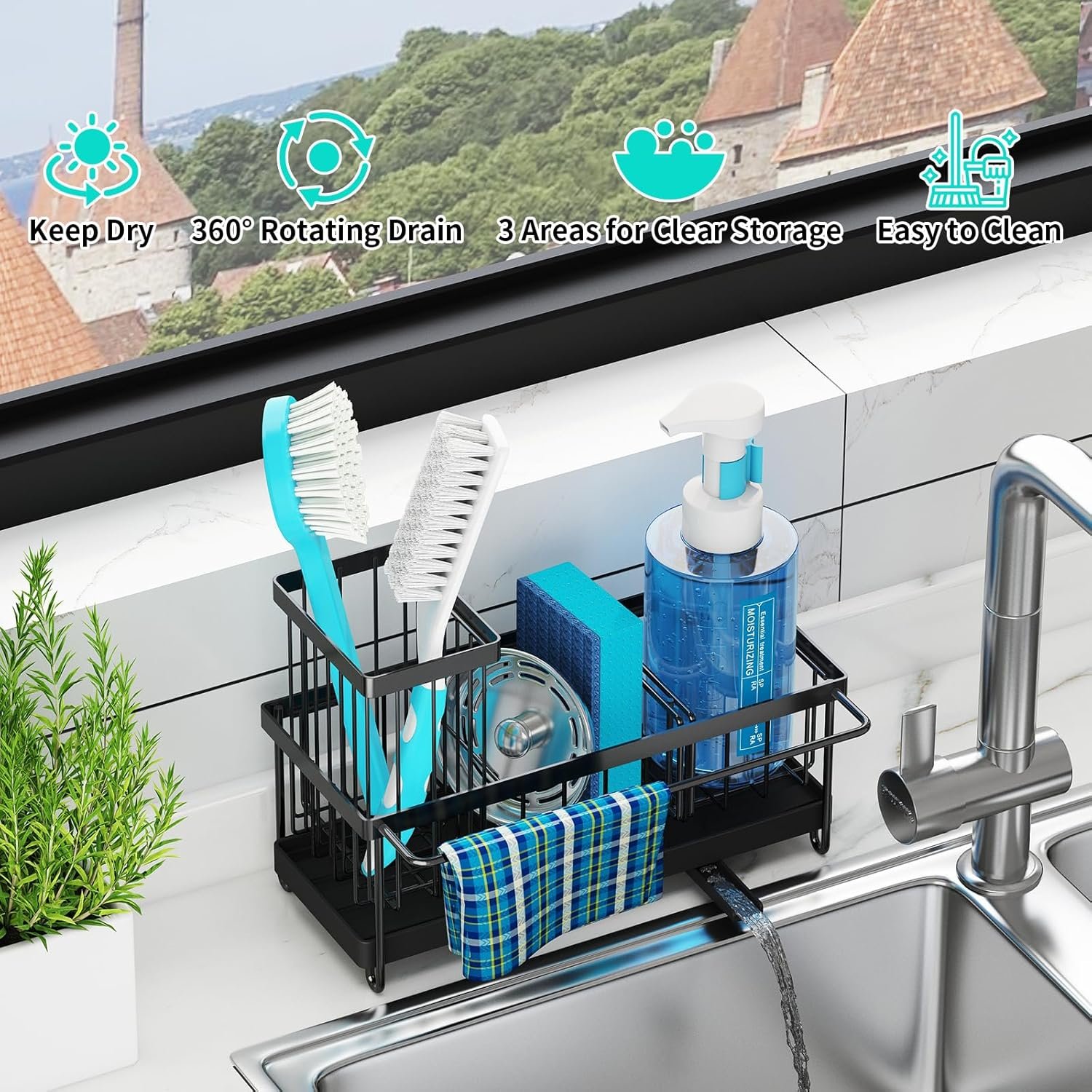 【3 Powerful Display Areas】- Godboat Sink Caddy has 3 powerful storage spaces. One side is a brush holder can effectively manage brushes, knives, and forks of different sizes in the kitchen, while the other side sponge holder with a metal baffle can store dish and soap dispenser sponges, sink covers, and short brushes. And in front of this Sink Sponge Holder is a metal cloth drying rod, which effectively organizes the widely used items in the kitchen