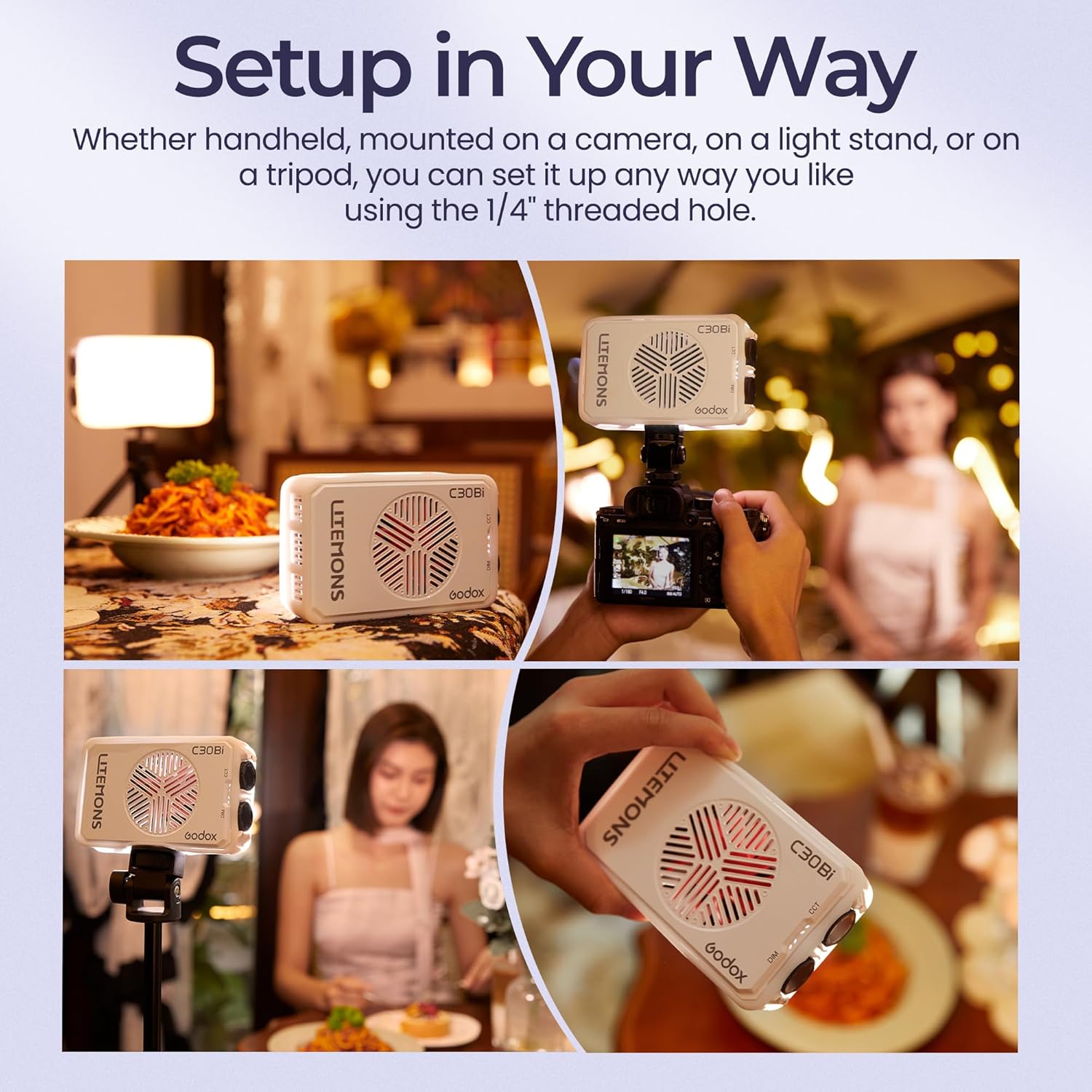 【Small Size & Standard 1/4 Screw】At just 248g and palm-sized, the c30Bi/R slips effortlesslyinto any pocket-perfect for taking it wherever you go! The 1/4 Screw can be mounted on a camera, on a light stand, or on a tripod, you can set it up any way you like