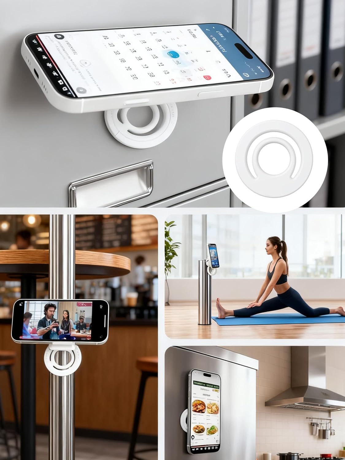 Grip, Phone Stand with Ring Holder, Compatible with Enabled Phones, Adjustable Stand for Hands-Free Viewing, Attachment to Surfaces, Wireless Charging Compatible Grip and Ring Holder: This white silicone phone stand comes with a grip and ring holder for secure one-handed use; The ring stand ensures a firm grip on your phone while the adjustable stand provides hands-free viewing in multiple angles Attachment: The sticker ring allows for easy attachment to various surfaces like refrigerators, gym equipment, and mirrors; This ring stand ensure your phone stays in place without slipping or falling Wireless Charging Compatible: Designed to work seamlessly enabled phones, this holder does not interfere with wireless charging; Simply attach or detach the grip as needed for charging convenience Adjustable Stand: The ring holder features a 360-degree adjustable stand for optimal viewing angles in both portrait and landscape modes; Ideal for watching videos, making calls, or browsing hands-free Durable and Portable: Made from high quality material, this holder is lightweight yet durable; The compact design makes it easy to carry in your bag or attach to your phone for on-the-go use