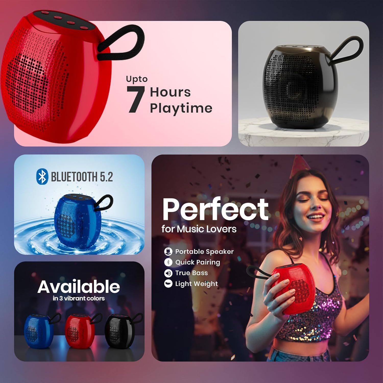 Grooves Boom Box Portable Bluetooth Speaker, True Bass, 7 Hours Playtime, Bluetooth 5.2, Lightweight, Quick Pairing, Perfect for Music Lovers