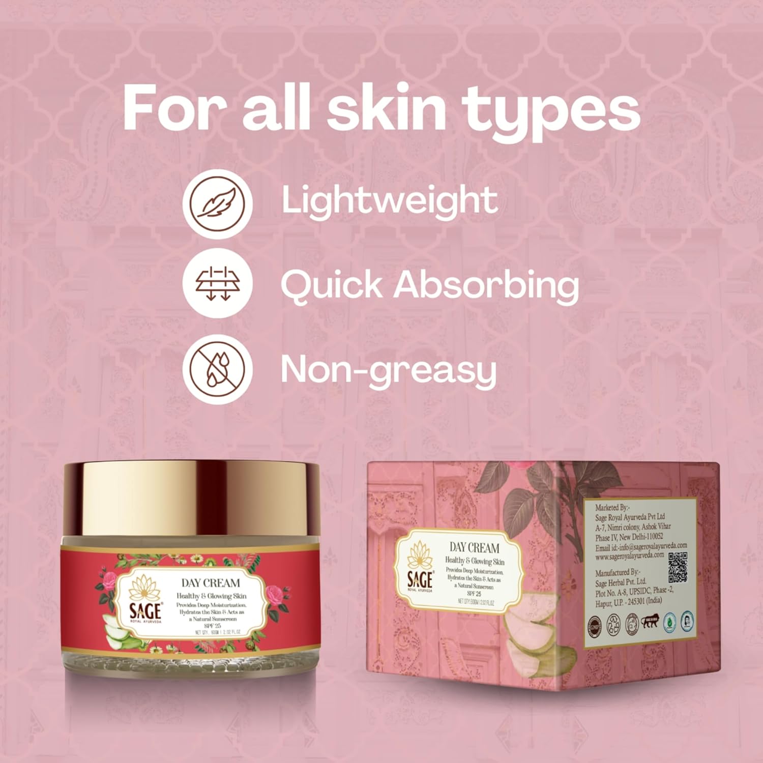 Hydrate, protect, and brighten your skin with Sage Royal Ayurveda Day Cream—your daily defense against dryness, and pigmentation. Specially created for mature skin, this nourishing herbal cream blends the skin-soothing powers of Chamomile, Aloe Vera, and Licorice with the protective strength of Titanium Dioxide and Zinc Oxide. This multitasking formula hydrates deeply, evens out skin tone, helps with sunburn and reduces stretch marks. With a creamy, fast-absorbing texture and a pleasant fragrance, it makes your morning skincare routine feel like a luxurious ritual.