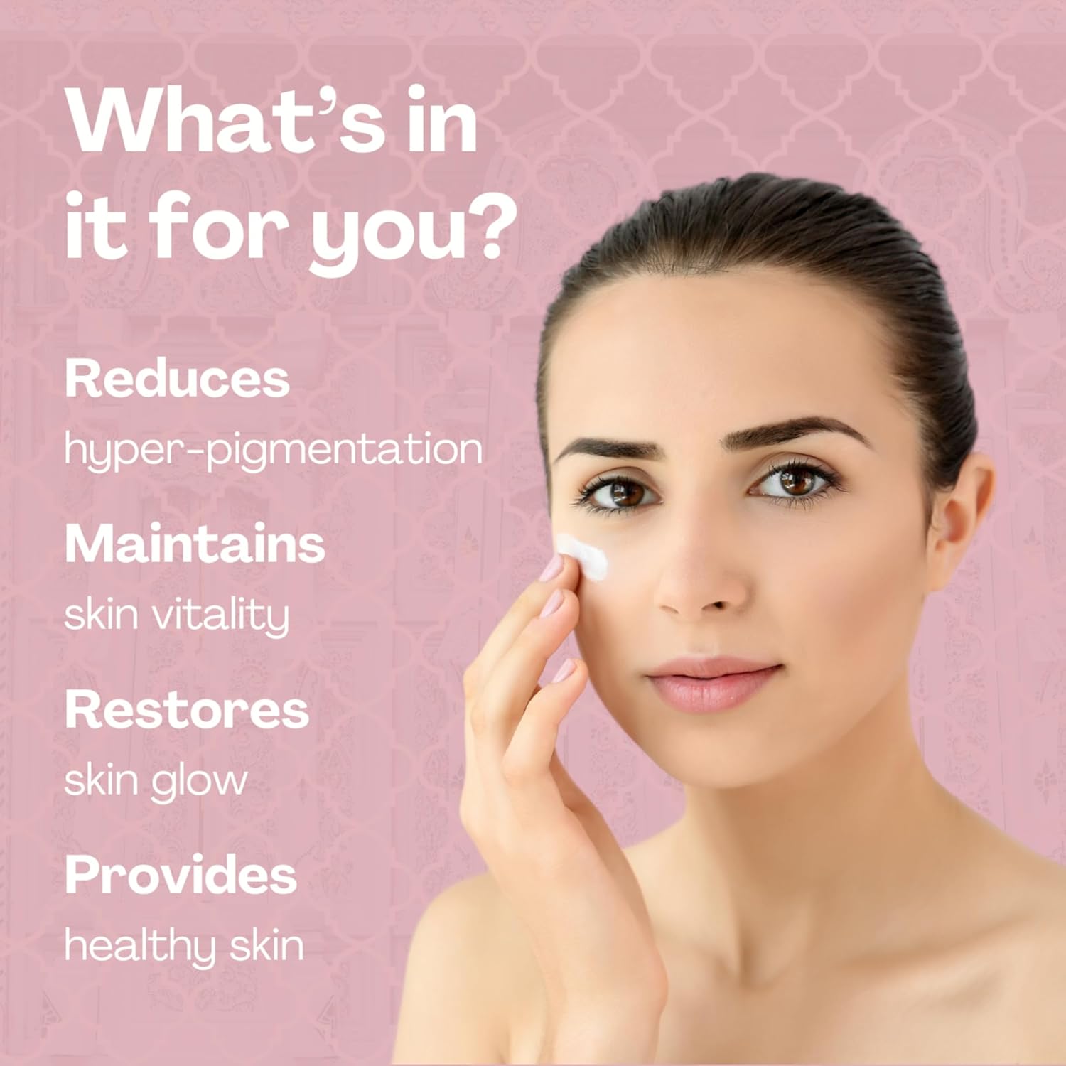 Protection against UVA and UVB radiation- Enriched with Zinc Oxide, Titanium Dioxide, and antioxidants, this cream protects your skin from the sun’s harmful rays—reducing dark spots, sunburn, and signs of early aging.
