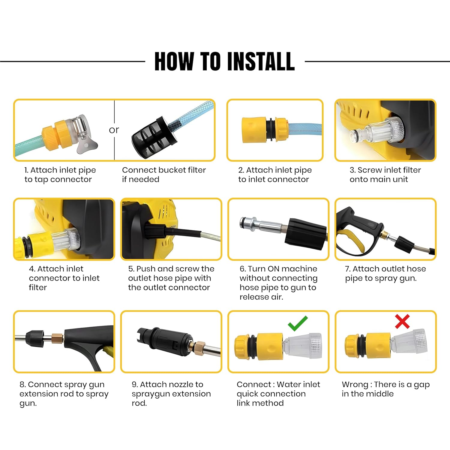 Includes 3 meters inlet pipe, 8 meters outlet hose, spray gun extension rod,1 inlet filter, 1 inlet connector,1 tap connector, 1 bucket water filter, foam spray bottle