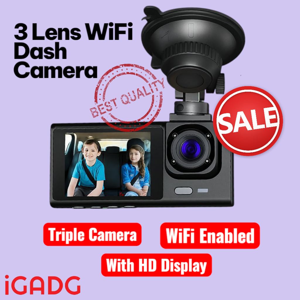iGADG WiFi 3 Lens Car Dash Camera Smart DVR DashCam with Reversing Video Recorder | Front HD Camera, Inside & Rear VGA Camera | Connect to Phone Through App