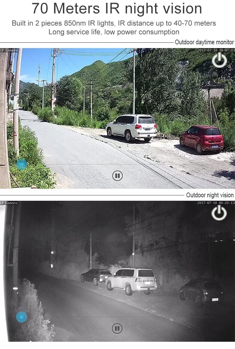 HD RESOLUTION 1080P & NIGHT VISION: 3 megapixel HD digital lens + IR-cut auto switch in day and night, 3.6mm/6mm lens, 2.8-12mm and 6-22mm auto focus lens as optional, 4 high-power array IR, effective night vision distance of 30-50 meters. NO WIRING NO ROUTER REQUIRED INSTANT INTALLATION WITHIN 2 MINUTES: You no need any technical person to install camera, Simply follow few steps to install this camera easily on your android and ios phone. No need any wiring and other things. HEAVY DUTY METAL BODY WATERPROOF IP67: IP66 weatherproof makes outdoor security camera ideal for using outside and keep recording in the ever-changing outdoor environment no matter rain or shine, summer or winter season.