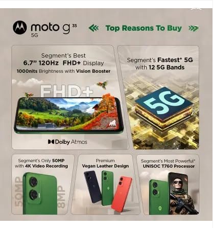 Meet the Motorola G35 5G (Midnight Black, 128 GB / 8 GB RAM) — a sleek and capable smartphone designed to elevate your everyday mobile experience. With its refined Midnight Black finish featuring a 3D PMMA back, it not only feels premium in hand but also sports a durable build with an IP52 water-repellent rating to protect against everyday splashes. Under the hood, it runs on the UNISOC T760 chipset paired with a generous 8 GB of RAM (plus 128 GB storage) to keep apps snappy and multitasking smooth. The 6.72-inch full-HD+ display delivers vibrant visuals and comes with a high refresh rate (up to 120 Hz) for smooth scrolling and gaming. Photography is solid, thanks to a 50 MP main rear camera alongside an 8 MP ultra-wide shooter, and a 16 MP front camera for clear selfies and video calls. Powering all this is a 5,000 mAh battery that keeps you going through your day, and supports fast charging (20 W) so you spend less time plugged in. In short, this Moto G35 5G strikes a smart balance of style, performance and value — perfect for users who want a dependable 5G handset without blowing their budget.