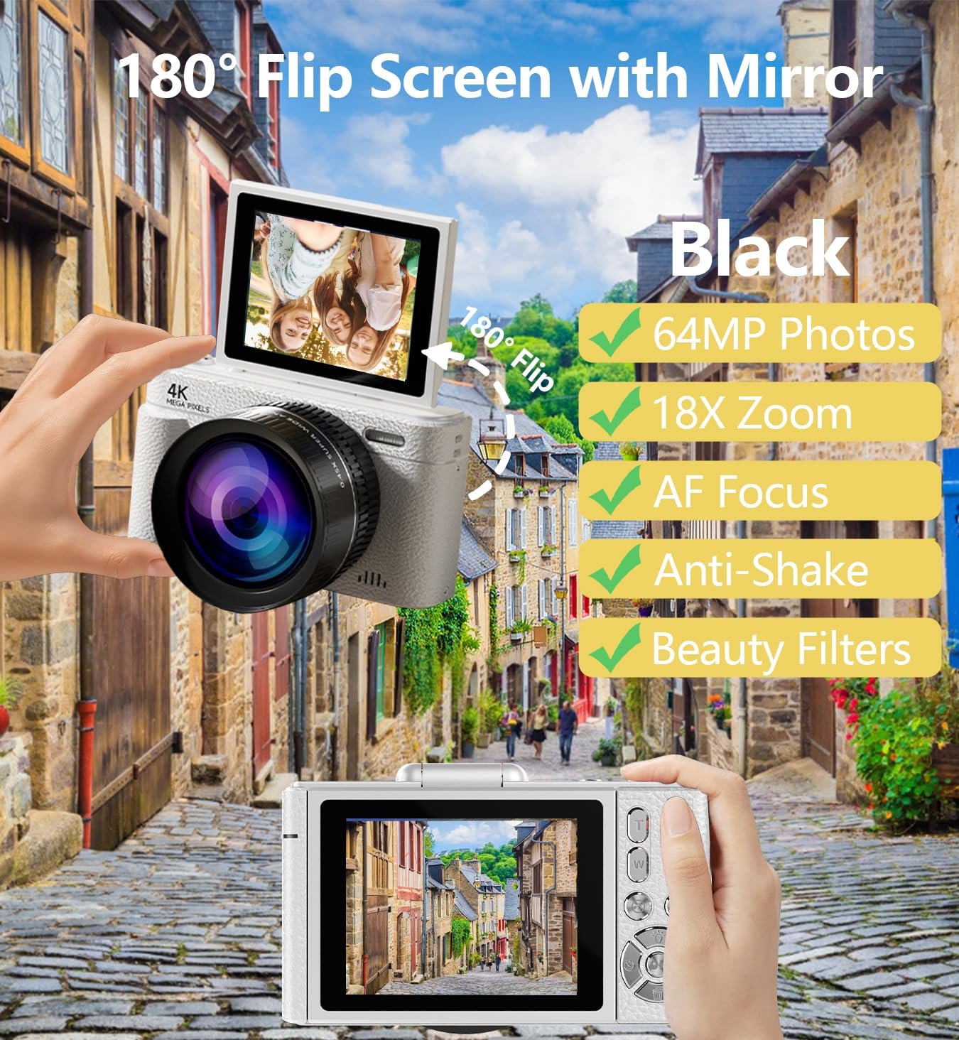 Vlogger-Friendly Design:180° flip-up screen with built-in mirror + 3 shooting modes (selfie/continuous/timer) + multiple beauty filters.