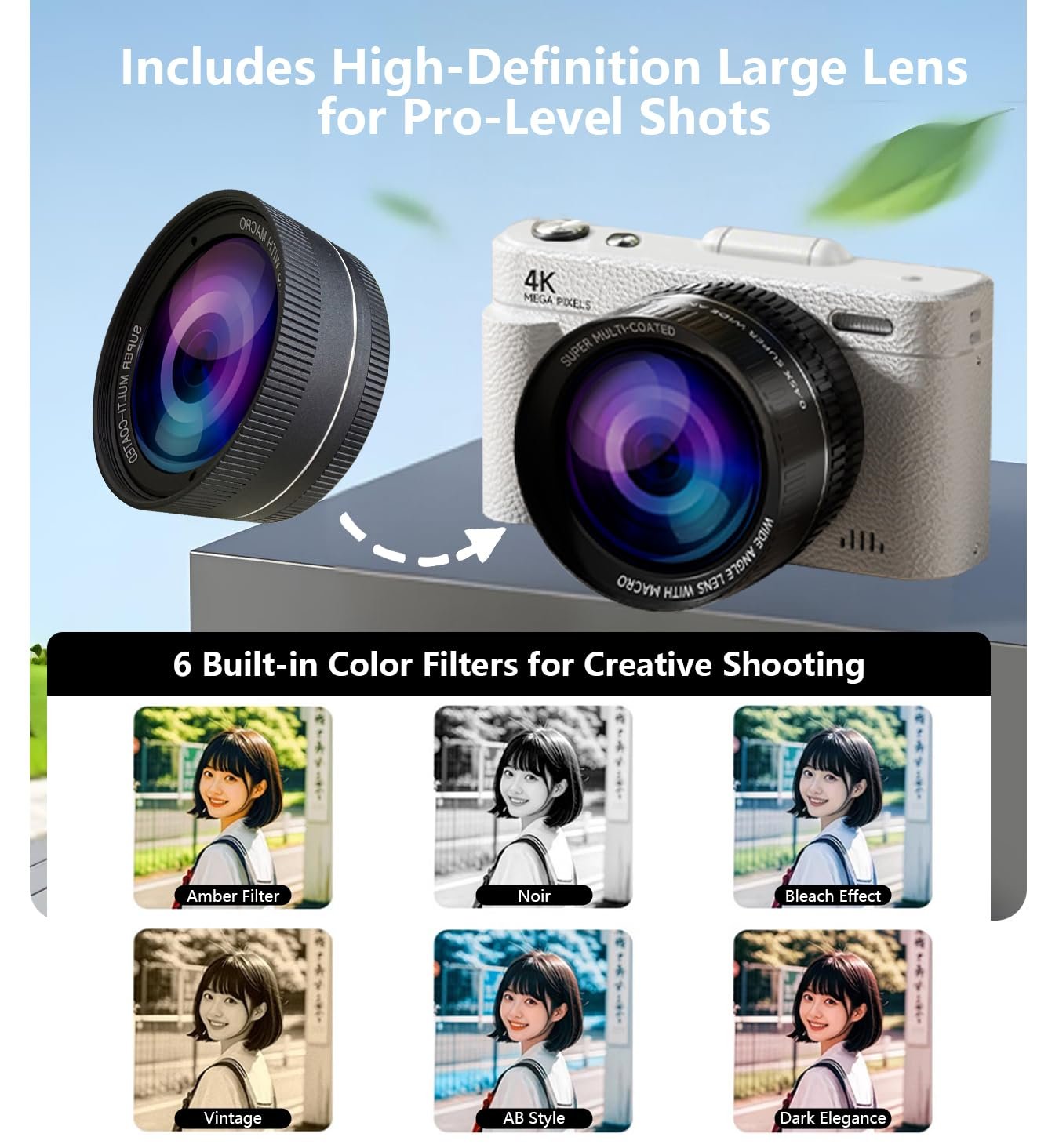 Includes Large Lens & Accessories: Comes with high-definition detachable lens, long-lasting battery, Type-C charging cable, 32G SD Card and user manual—ready to use.