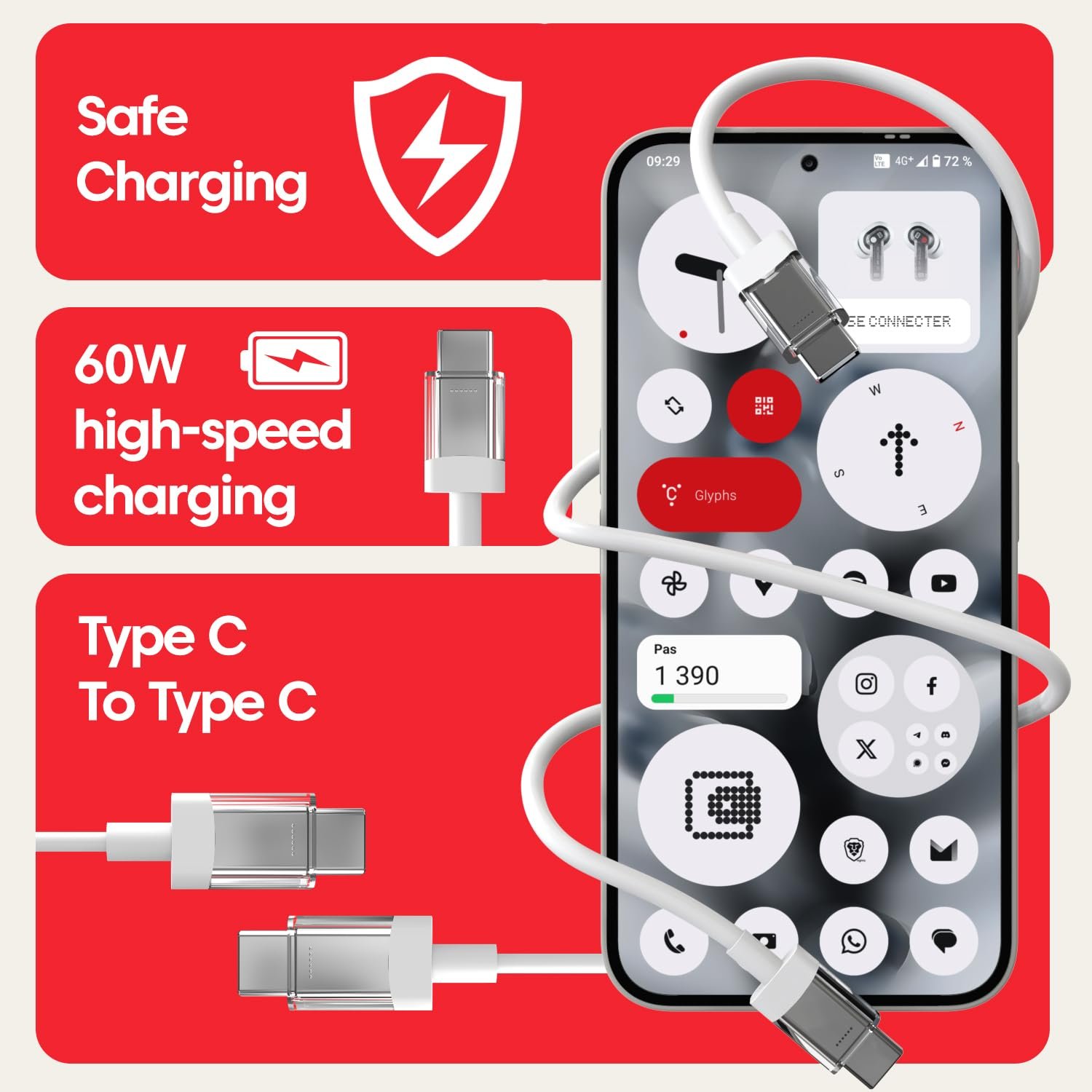 ✅【65W Super Fast Charging for Maximum Efficiency】: Engineered to deliver up to 65W of blazing-fast charging power, this Nothing Original USB-C to USB-C cable ensures your devices reach full battery in record time. Whether you’re charging a smartphone, tablet, or laptop, its advanced power delivery technology provides stable and safe charging, reducing waiting time and boosting productivity. Perfect for busy professionals, gamers, and travelers.
