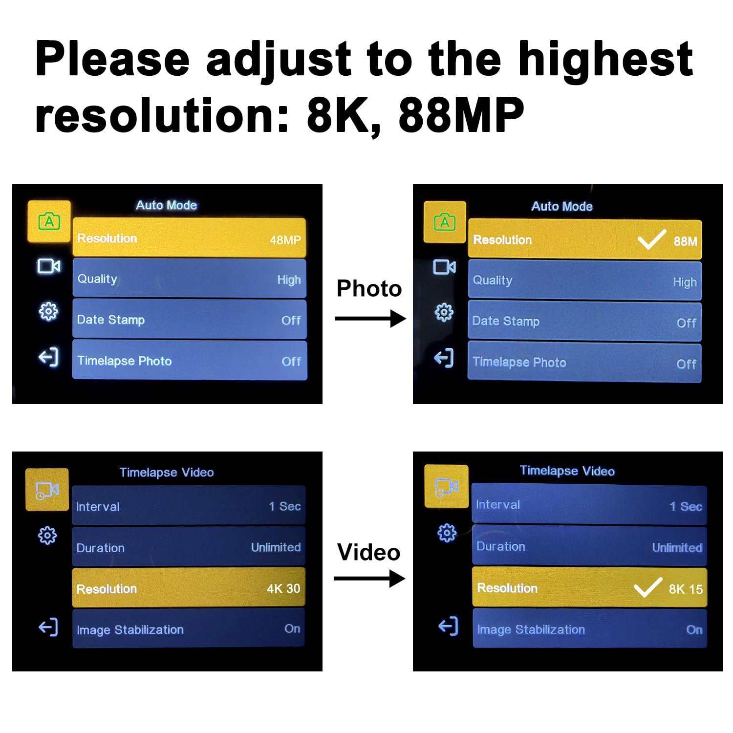 Warm Tips 1. This camera supports a maximum video resolution of 8K and a maximum photo resolution of 88MP. Manual adjustments are required during use. 2. The battery requires charging before first use. 3. What should I do if the camera cannot connect to my phone? (1) Restart the camera and re-enable Wi-Fi mode. (2) Ensure the app is connecting to the camera’s Wi-Fi network, not your home Wi-Fi. (3) Verify the entered password is correct. (4) Keep your phone within 5 meters of the camera.