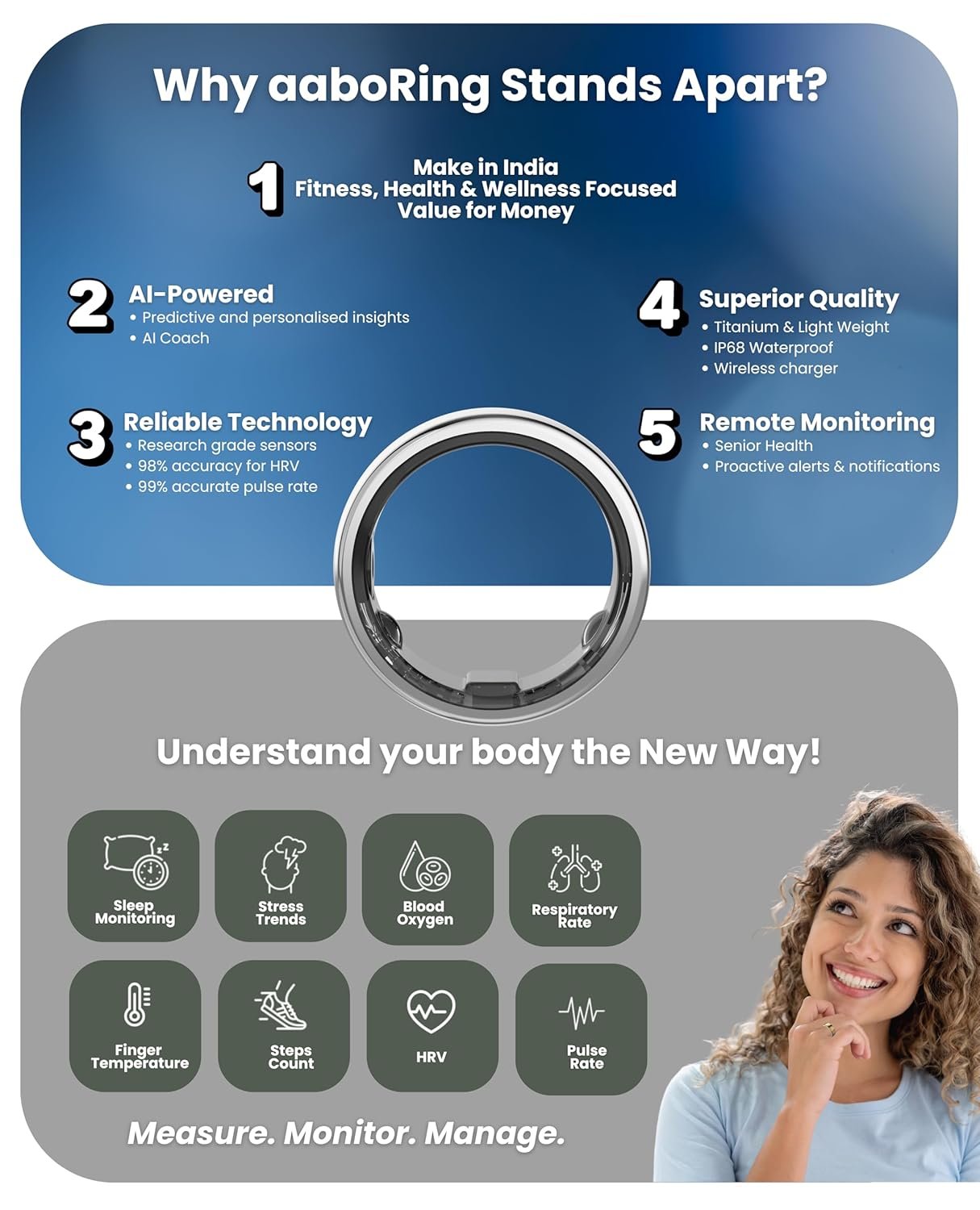 TAILORED GUIDANCE & TIMELY ALERTS: Access personalized insights through the aabo Ring mobile app with daily, weekly, and monthly overviews. Receive proactive notifications and reminders based on your events and goals, ensuring timely prompts for essential tasks such as hydration, nutrition, and sleep preparation.
