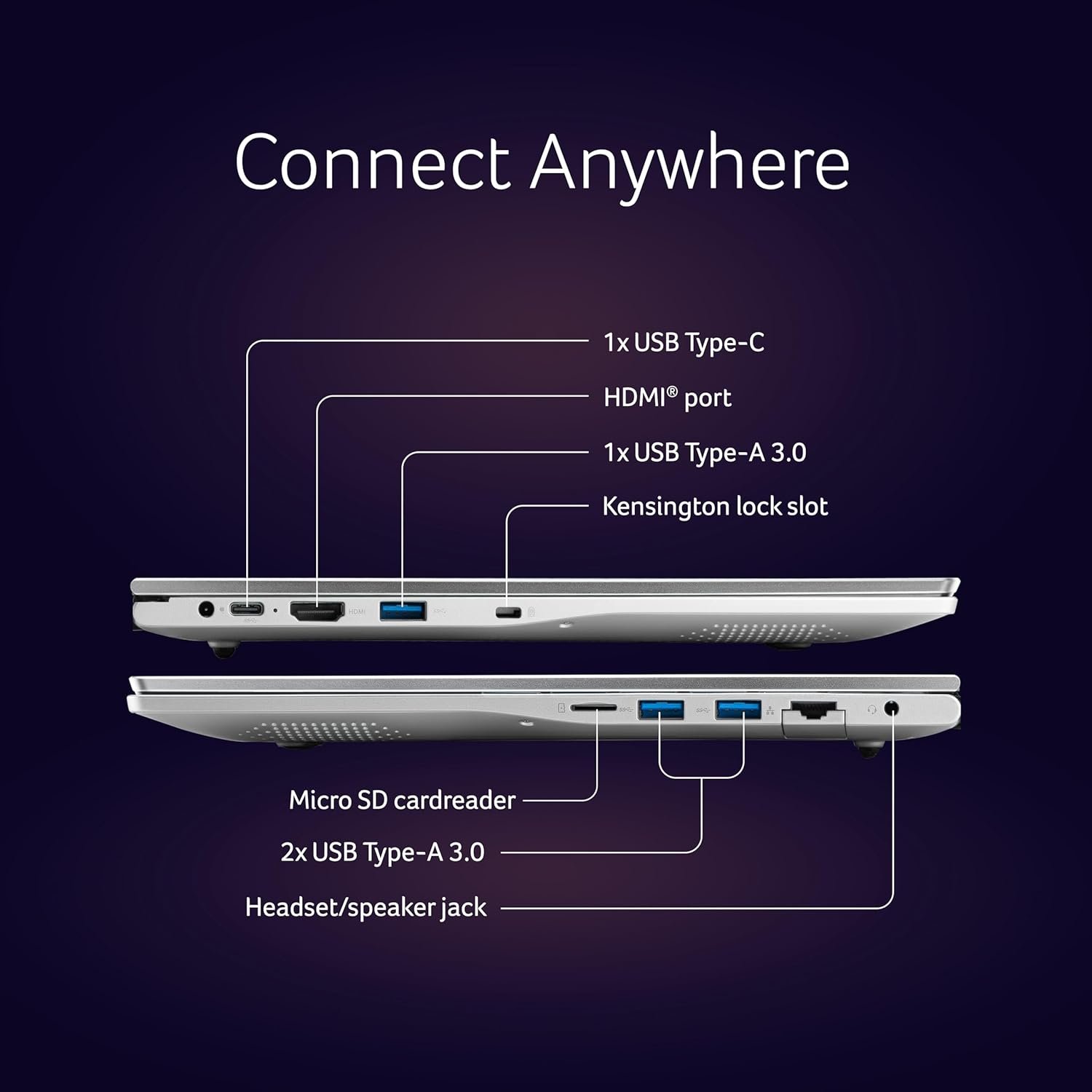 Get your connect on with a buffet of ports including USB ports, HDMI, a Kensington lock slot, and a headset/speaker jack.