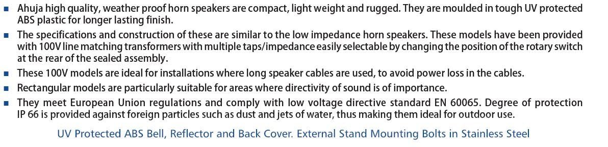 Ahuja high quality, weather proof horn speakers are compact, light weight and rugged. They are moulded in tough UV protected ABS plastic for longer lasting finish. The specifications and construction of these are similar to the low impedance horn speakers. These models have been provided with 100V line matching transformers with multiple taps/impedance easily selectable by changing the position of the rotary switch at the rear of the sealed assembly.