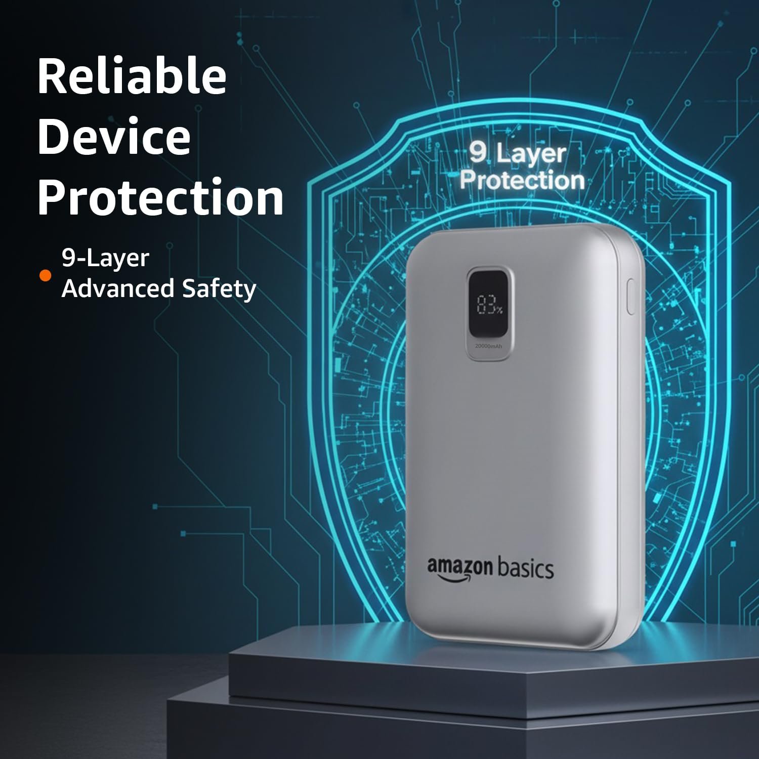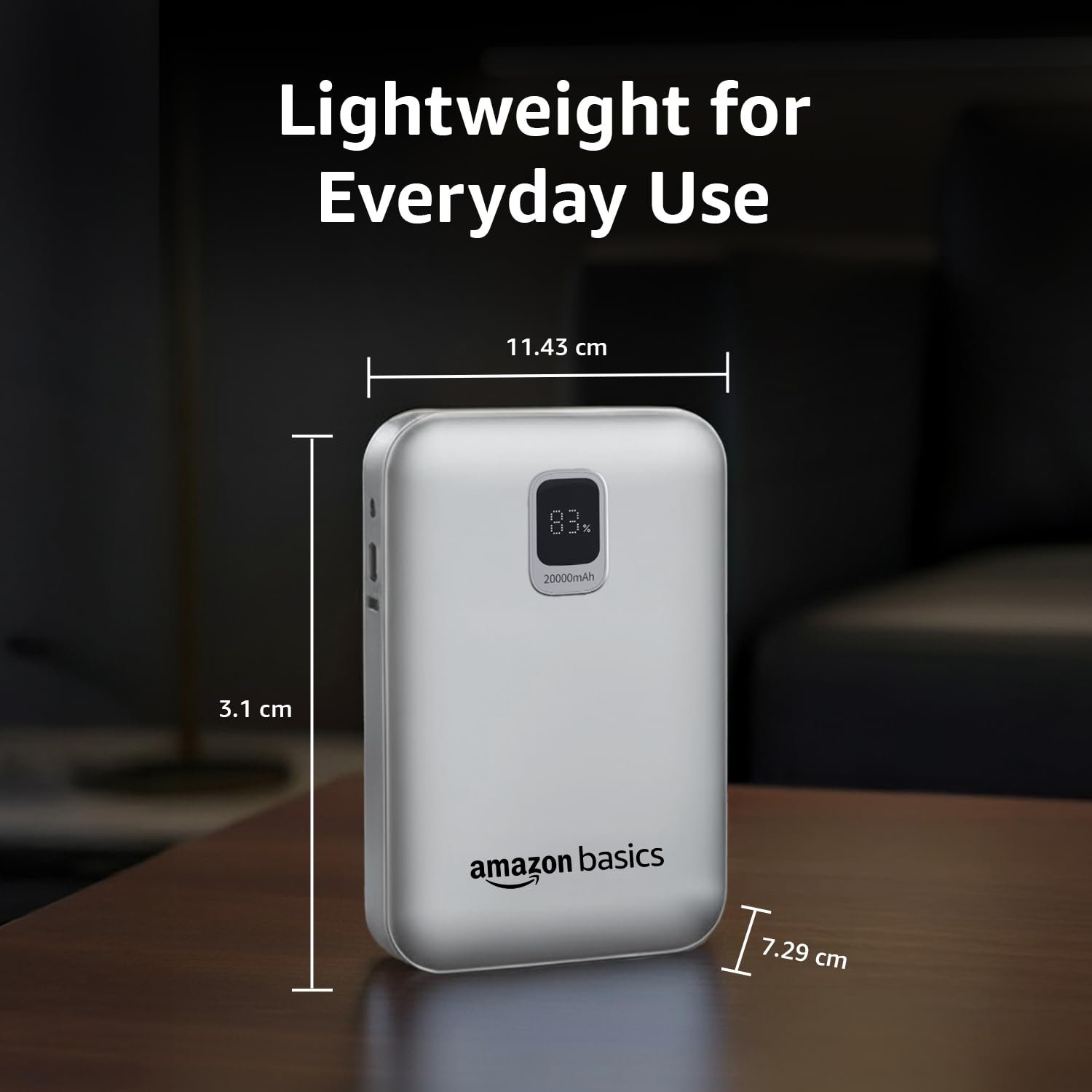 The amazon basics 20000mAh power bank is powerful, durable, and great for travel. It charges phones 3–4 times easily and supports fast charging with dual USB and Type-C ports. The design is sturdy, with LED indicators and safety protection. A bit slow to recharge, but overall a great value and reliable performer. ⭐