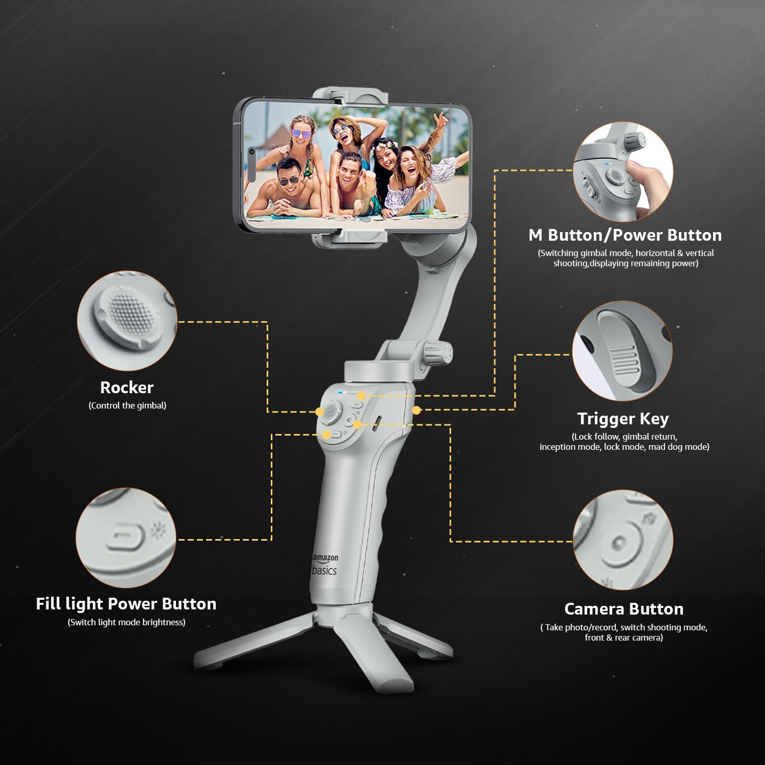 Amazon Basics 3-Axis Smartphone Gimbal Stabilizer with AI Face & Body Tracking | Foldable Design | Adjustable Fill Light | 8 Hr Battery | iPhone, Android Compatible | Perfect for travel/vlogging, Grey