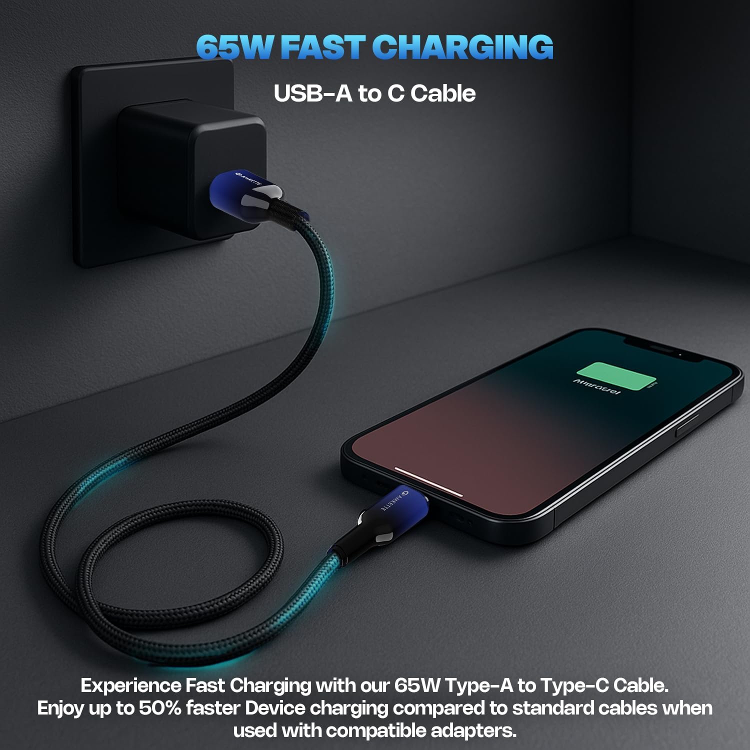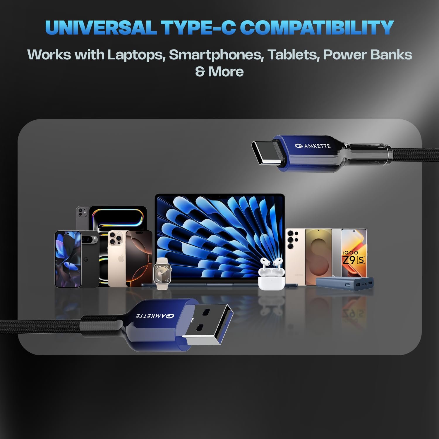 Amkette ChargePro 65W Type C Cable Fast Charging | USB A to Type C Cable | 1.5M Braided Cable with Silicon Reinforced Connectors | Data Transfer, Laptop & Mobile Compatible | Durable Braided Design