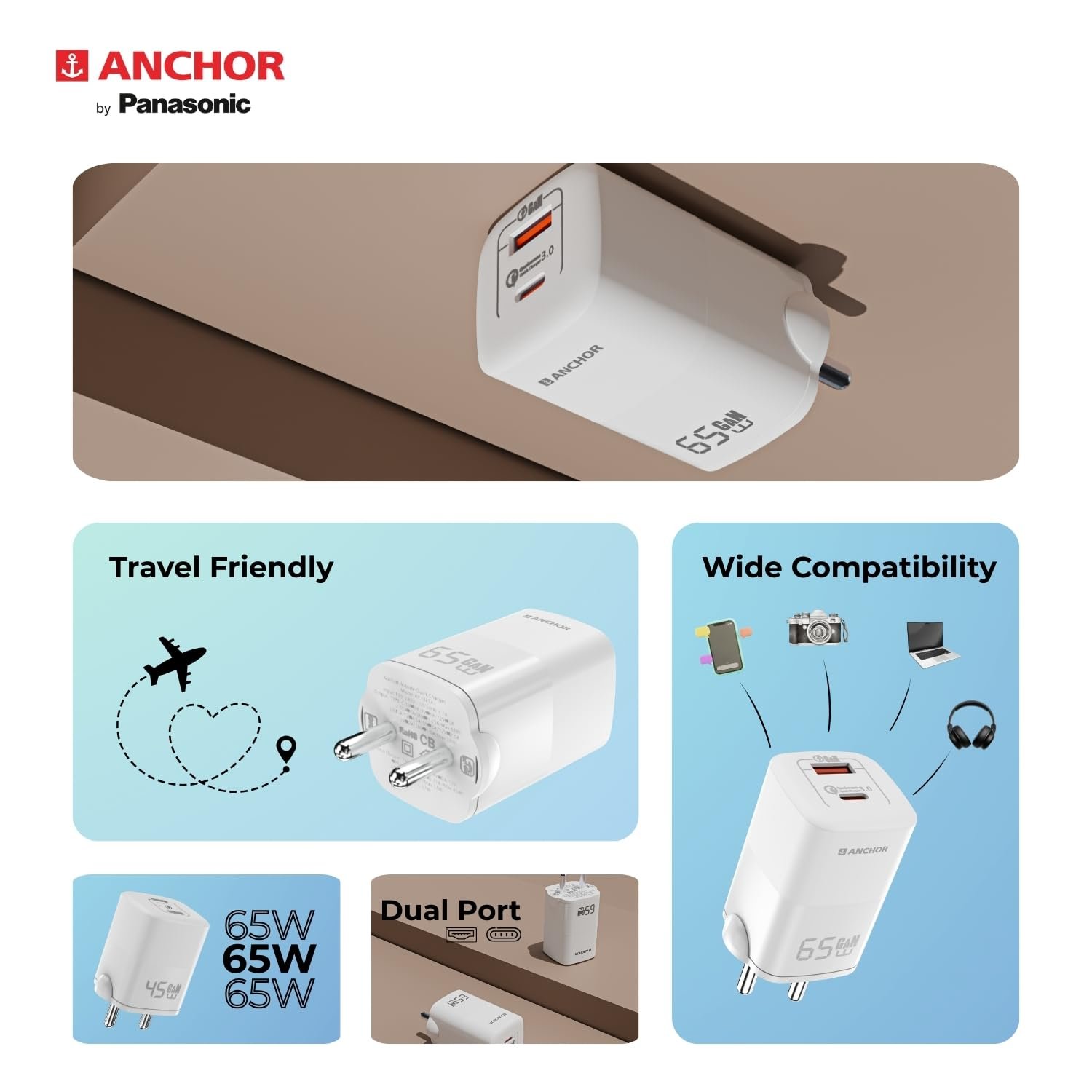 The ANCHOR 65W Charging Adapter combines powerful charging performance with the latest GaN technology to deliver fast, efficient, and safe power for your devices. Equipped with dual ports—one USB-C capable of outputting up to 65W and one USB-A with up to 30W—this adapter lets you charge multiple devices simultaneously without compromising speed. Designed to work with a wide voltage range (100-240V), it’s perfect for worldwide travel. Safety is paramount with integrated Smart IC technology, offering protection against overload, short circuits, and over voltage, ensuring your devices charge safely every time. The compact, lightweight design makes it ultra-portable, while BIS certification guarantees quality and compliance. Whether for work, travel, or daily use, the ANCHOR 65W Charger provides reliable, high-efficiency power delivery to keep your devices ready whenever you need them.