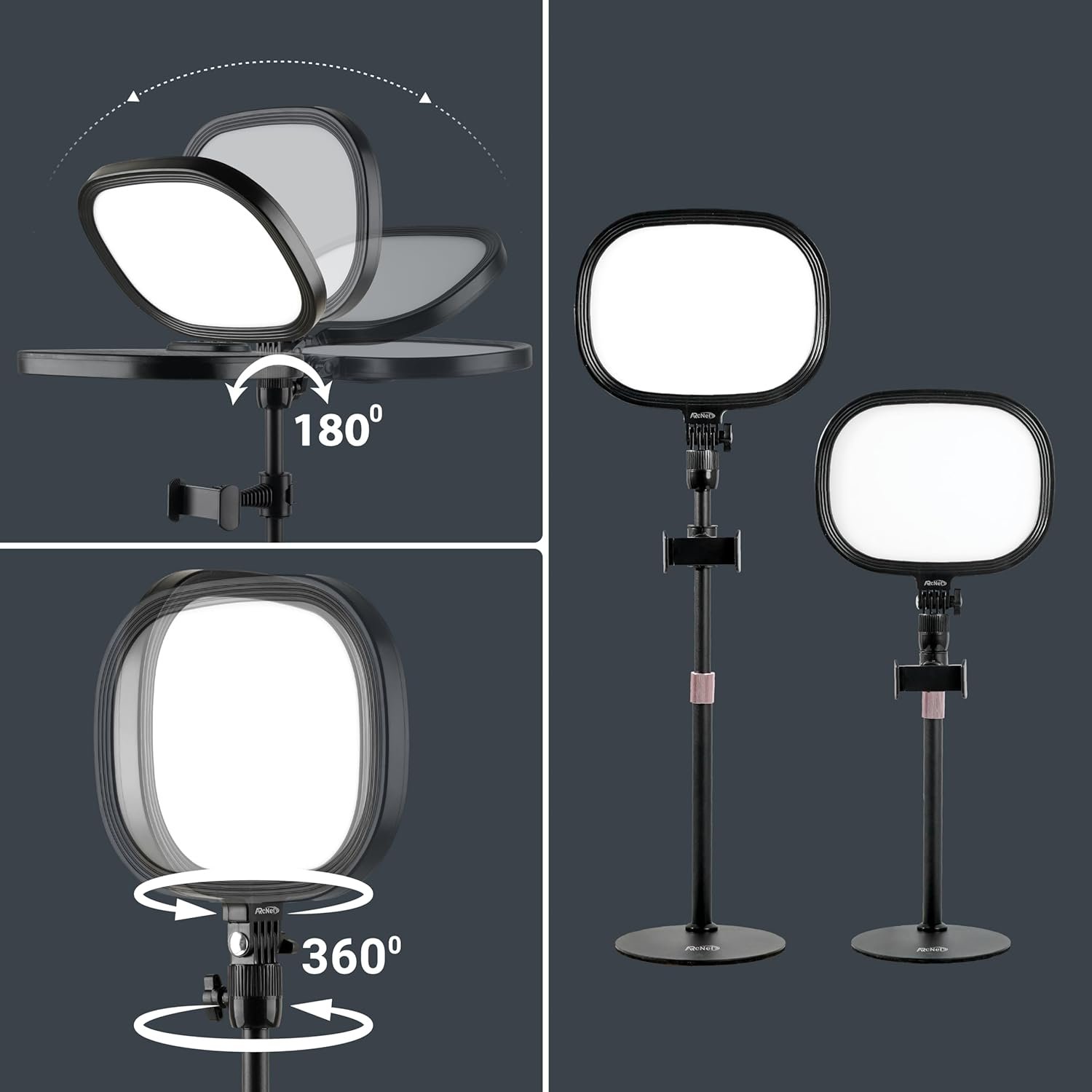 Flexible and Space-Saving: The webcam light head offers 360° omni-directional rotation, allowing you to adjust it back and forth, left and right, or up and down for perfect illumination. Ideal conferencing fill light behind or next to your laptop or monitor, it also as study or reading lamp. Equipped with a universal 360° rotating phone holder, it’s perfect for video chatting or recording