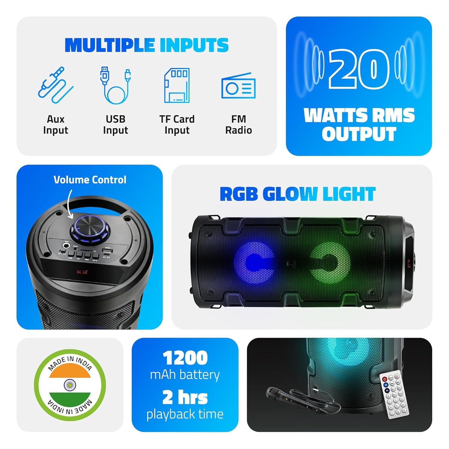 Total Power Output 20W RMS, Bluetooth version: 5.0, Battery Capacity: 1200mAh, Playback time: 2 Hours