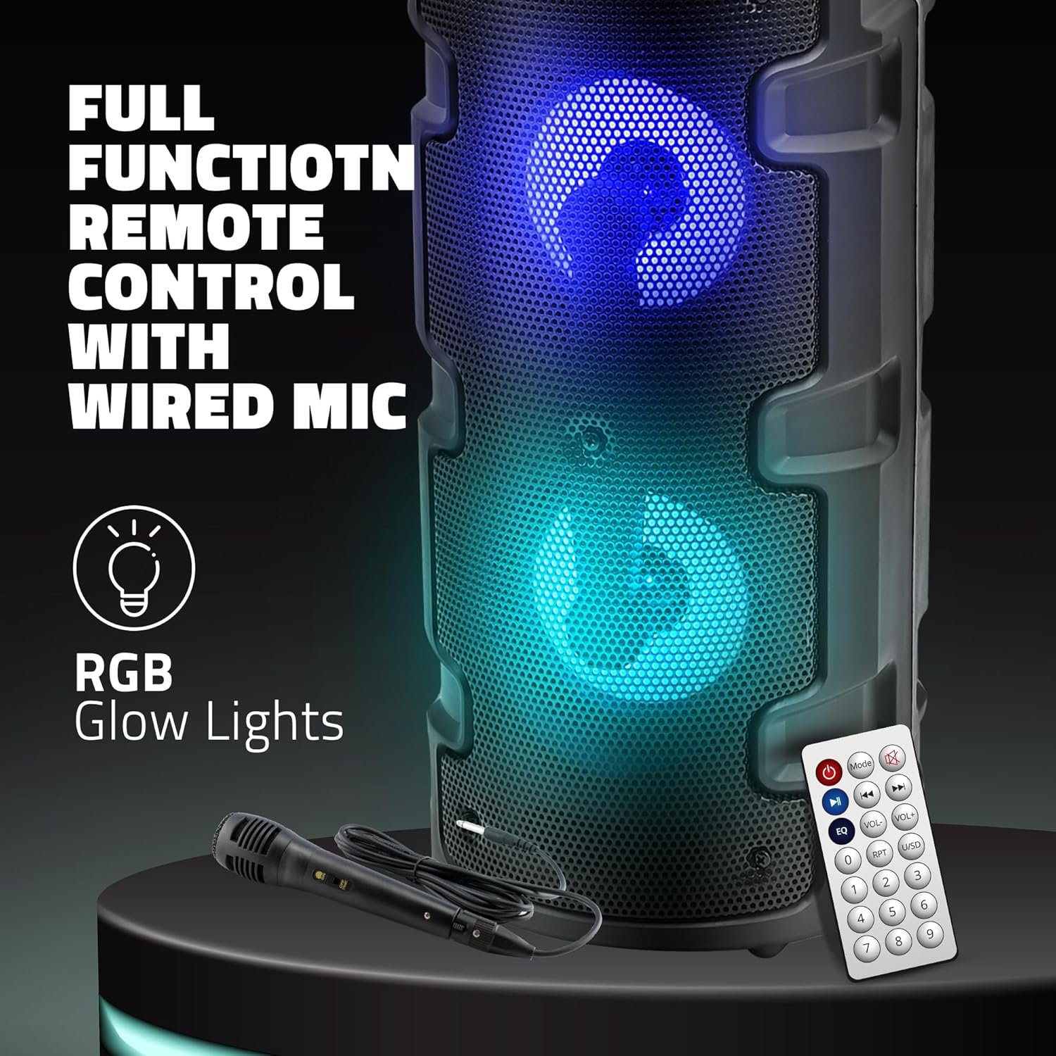 First of all, the facility like RGP Glow is good but above all I wasted the money since the holder hook was broken while I was carrying the speaker from it and the speaker was broken.The remote control is such a watse, no bass.
