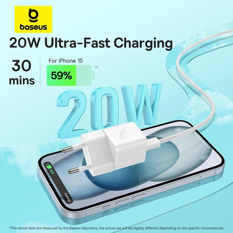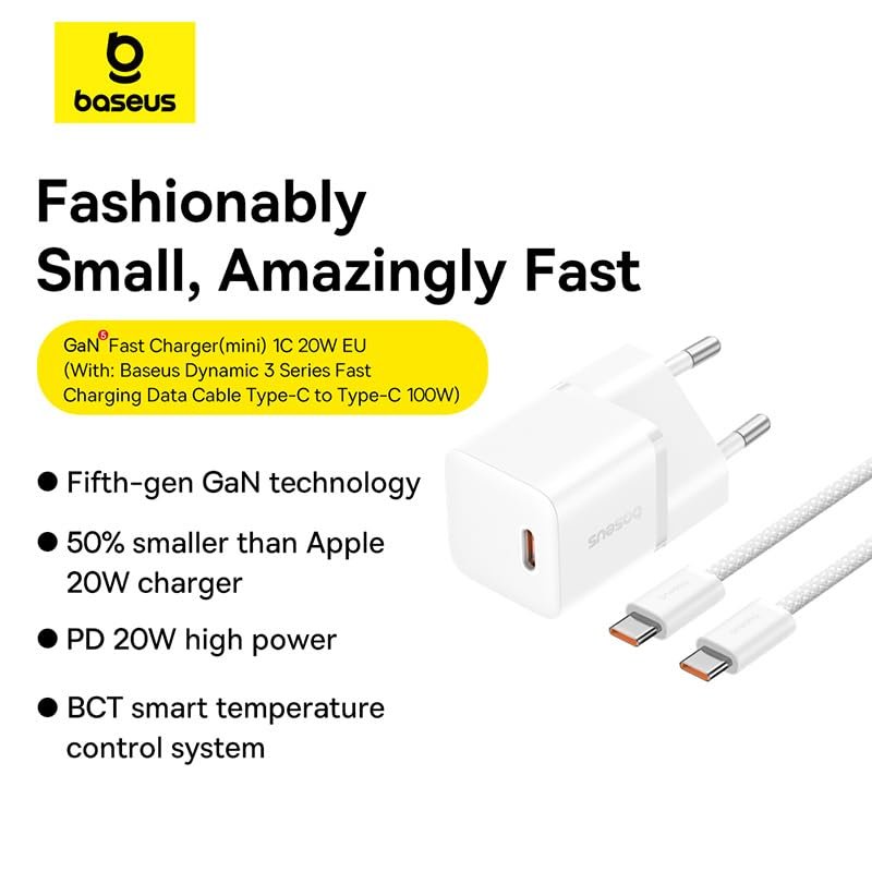 Baseus GaN5 Mini 20W Fast Charger (1C) – EU Plug, Compact GaN USB-C Wall Adapter with 100W Type-C to Type-C Cable – Moon White