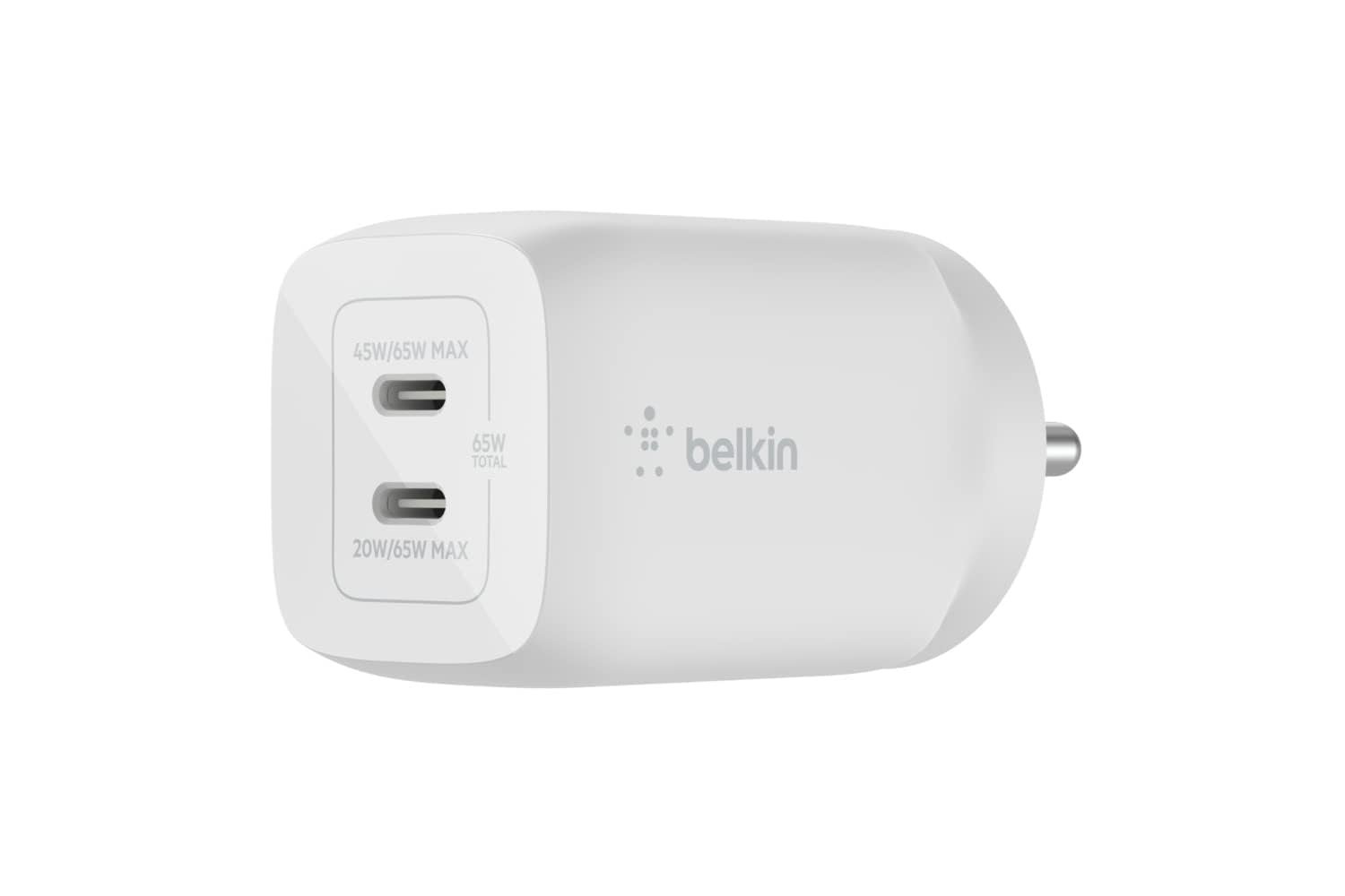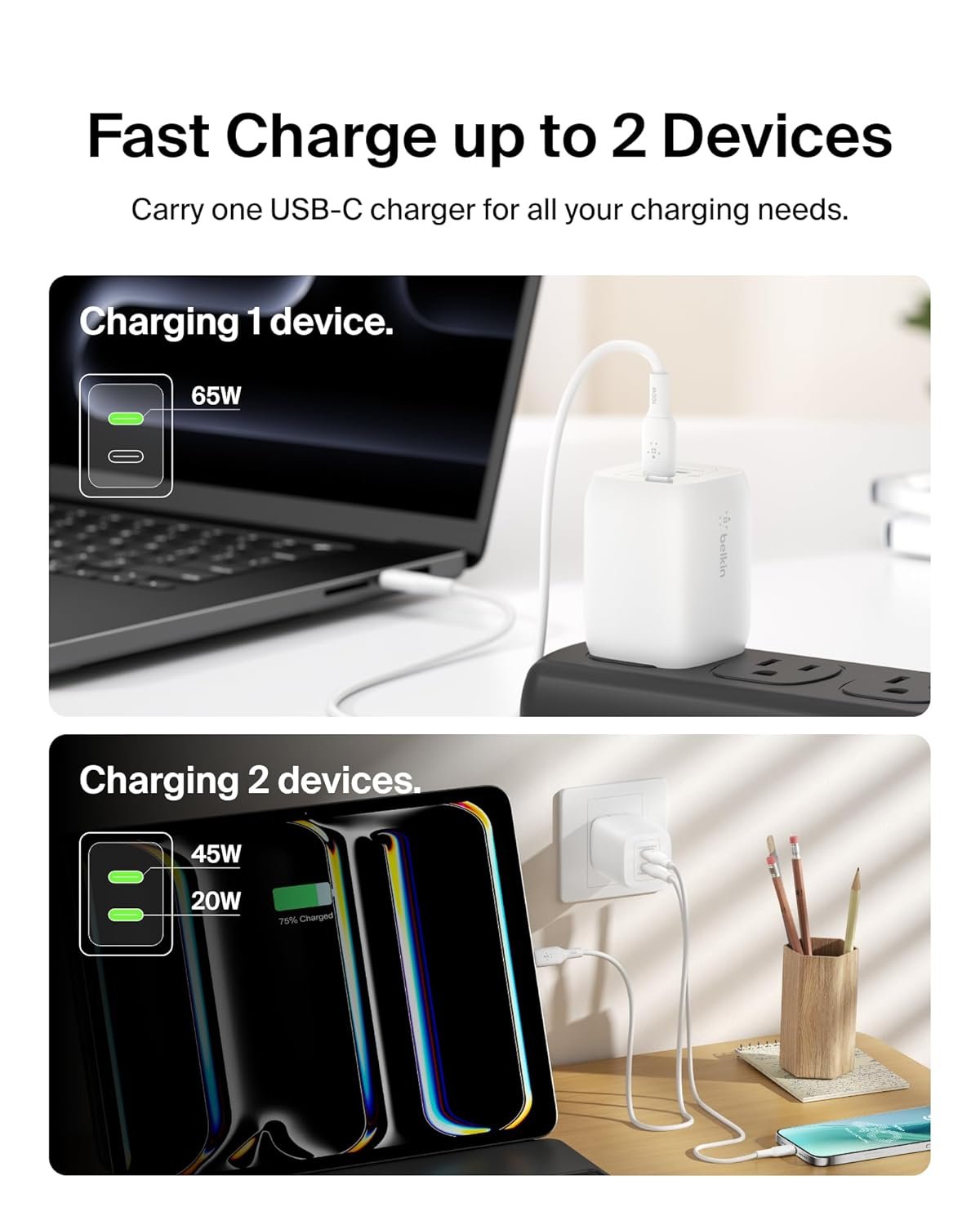 Belkin 65W (45W+20W) USB -C GaN Charger | Fast Charging PD | Gan Technology for Samsung Galaxy S25, Apple iPhone 17, Air, Pro, Pro Max, iPad, MacBook & More | 2 Years Warranty | White