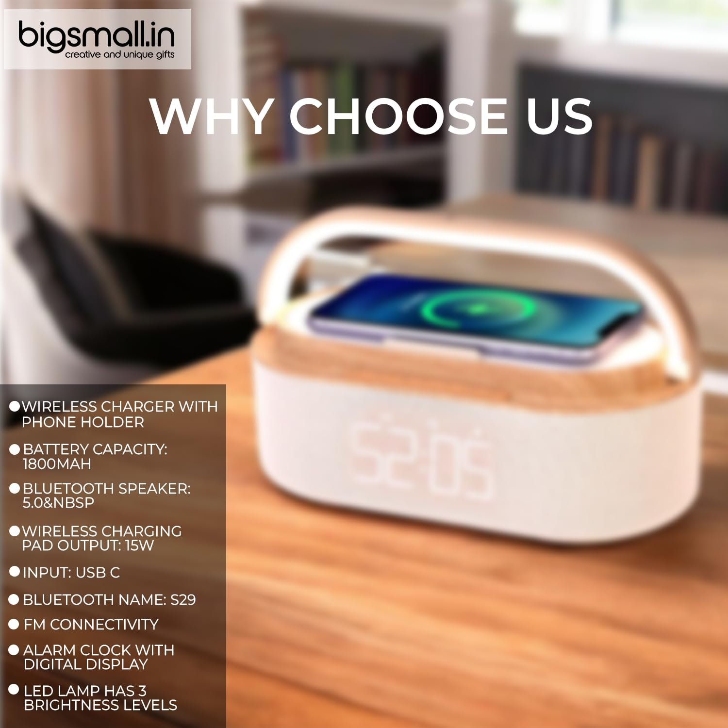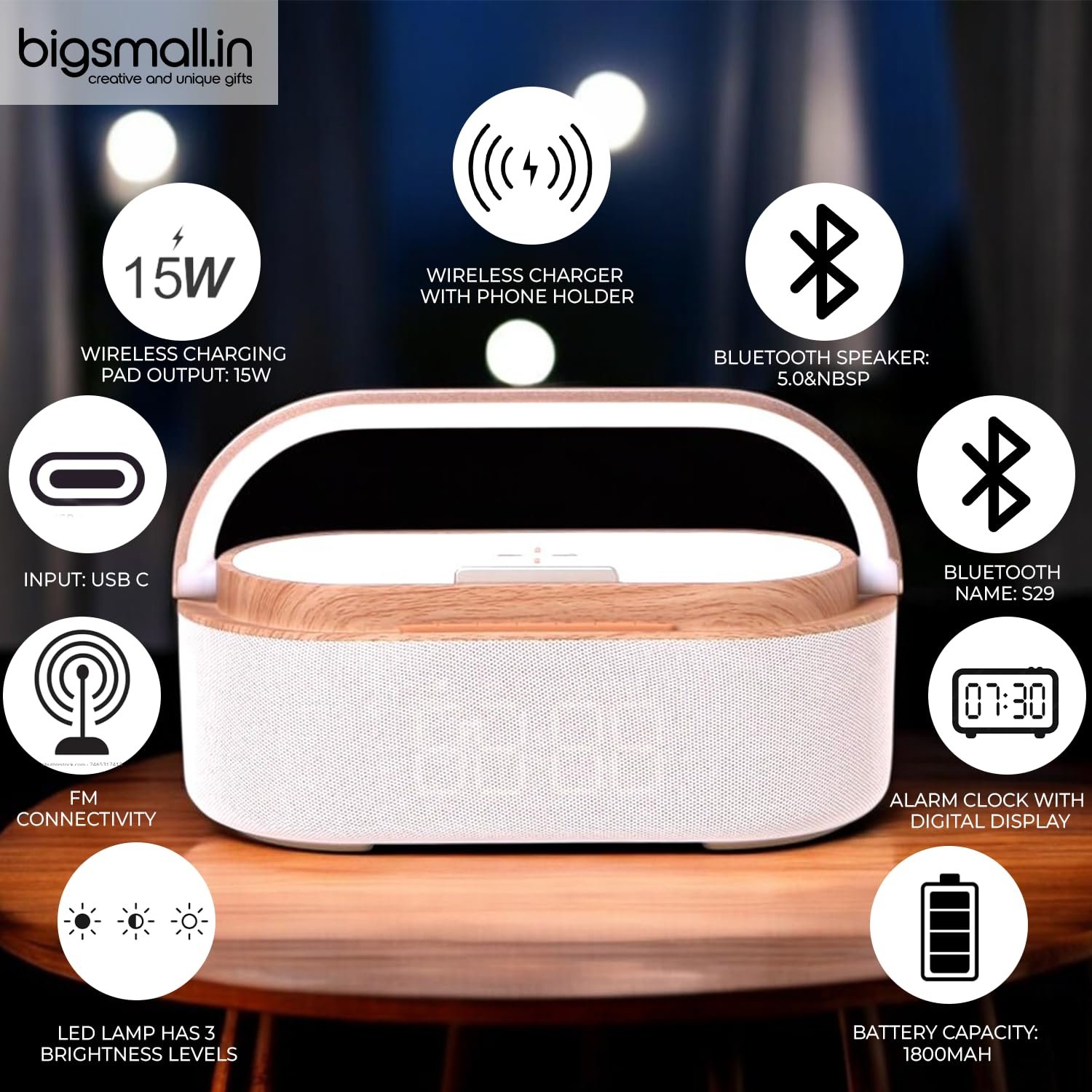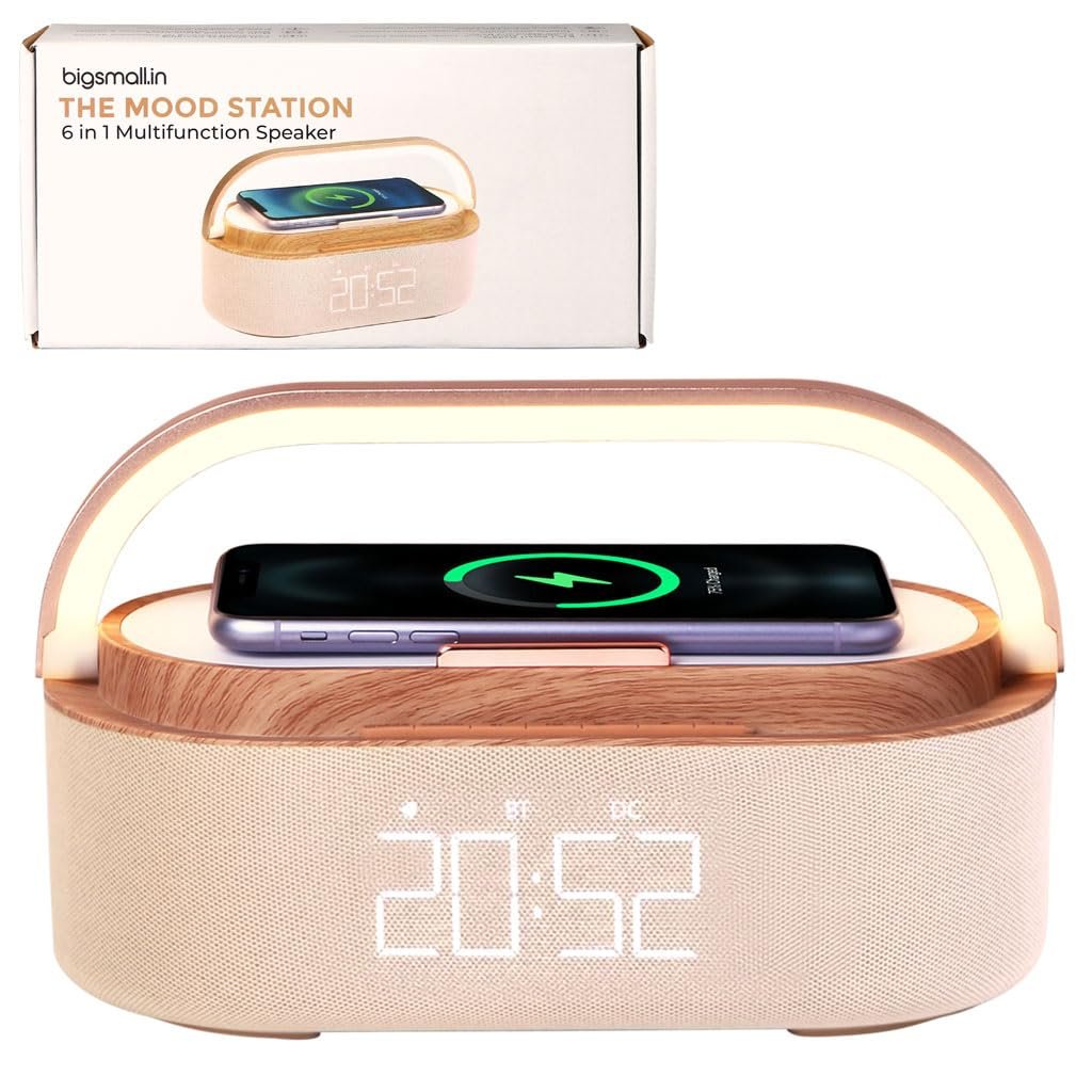 ✅6-in-1 Multifunctional Design – This all-in-one device combines a Bluetooth speaker, alarm clock, 15W wireless phone charger, FM radio, phone holder, and dimmable LED lamp, offering convenience and functionality in a sleek, compact design perfect for any space