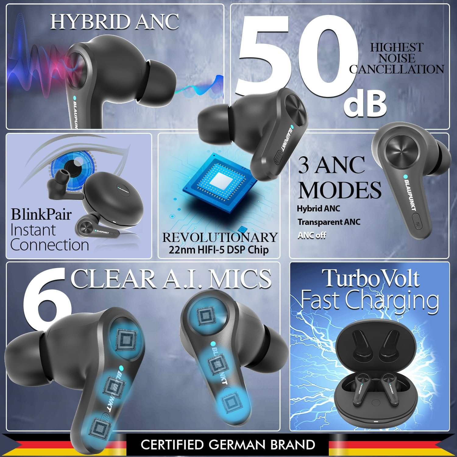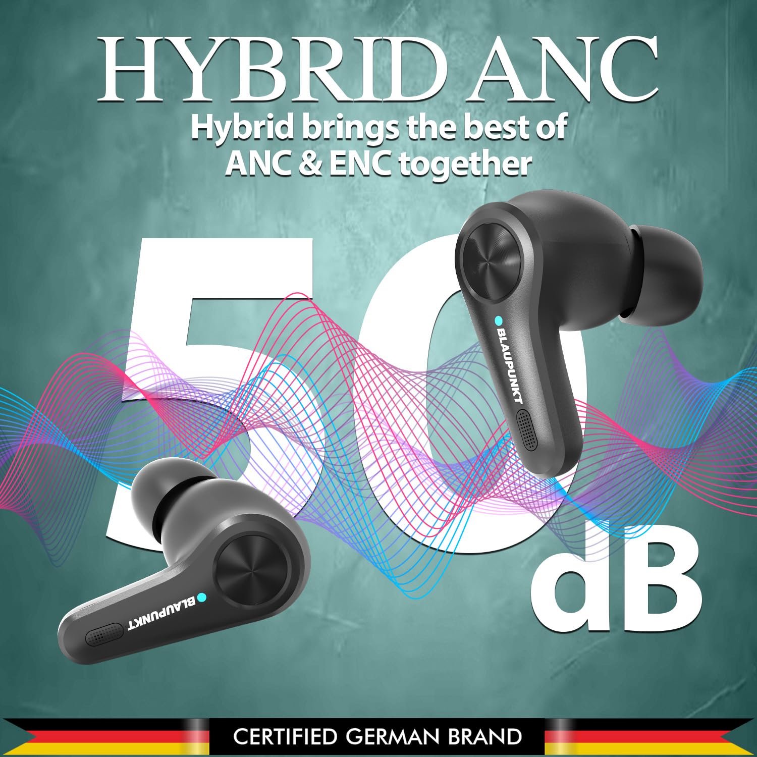 Blaupunkt BTW300 Rhodium Moskha Hybrid ANC in Ear Wireless Earbuds with 50Db I 6 Mics CRISPR ENC I Blink Pair Tech I Ambient Mode Noise Cancelling I Turbovolt Fast Charging(Ebony Black)