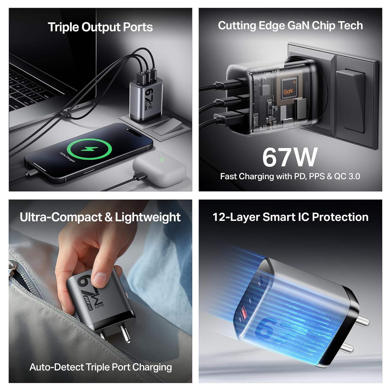 3 Output Ports & Auto-Detect Technology: Need to charge multiple devices? With USB-A (30W QC 3.0) and dual Type-C ports (67W PD, PPS), this charger delivers 45W + 7.5W + 7.5W (Max) across 3 smart output ports.