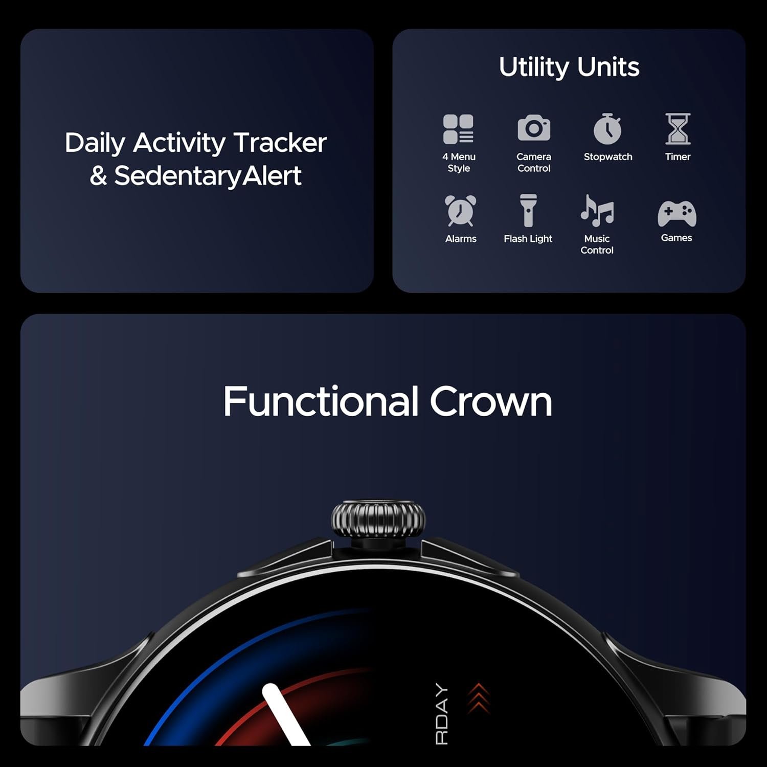 Functional Crown: Easily navigate through menus and options using the Functional Crown for convenient control.; IP68 Dust, Sweat & Splash Resistance: Designed to withstand the elements, this smartwatch offers protection against dust, sweat, and water splashes.