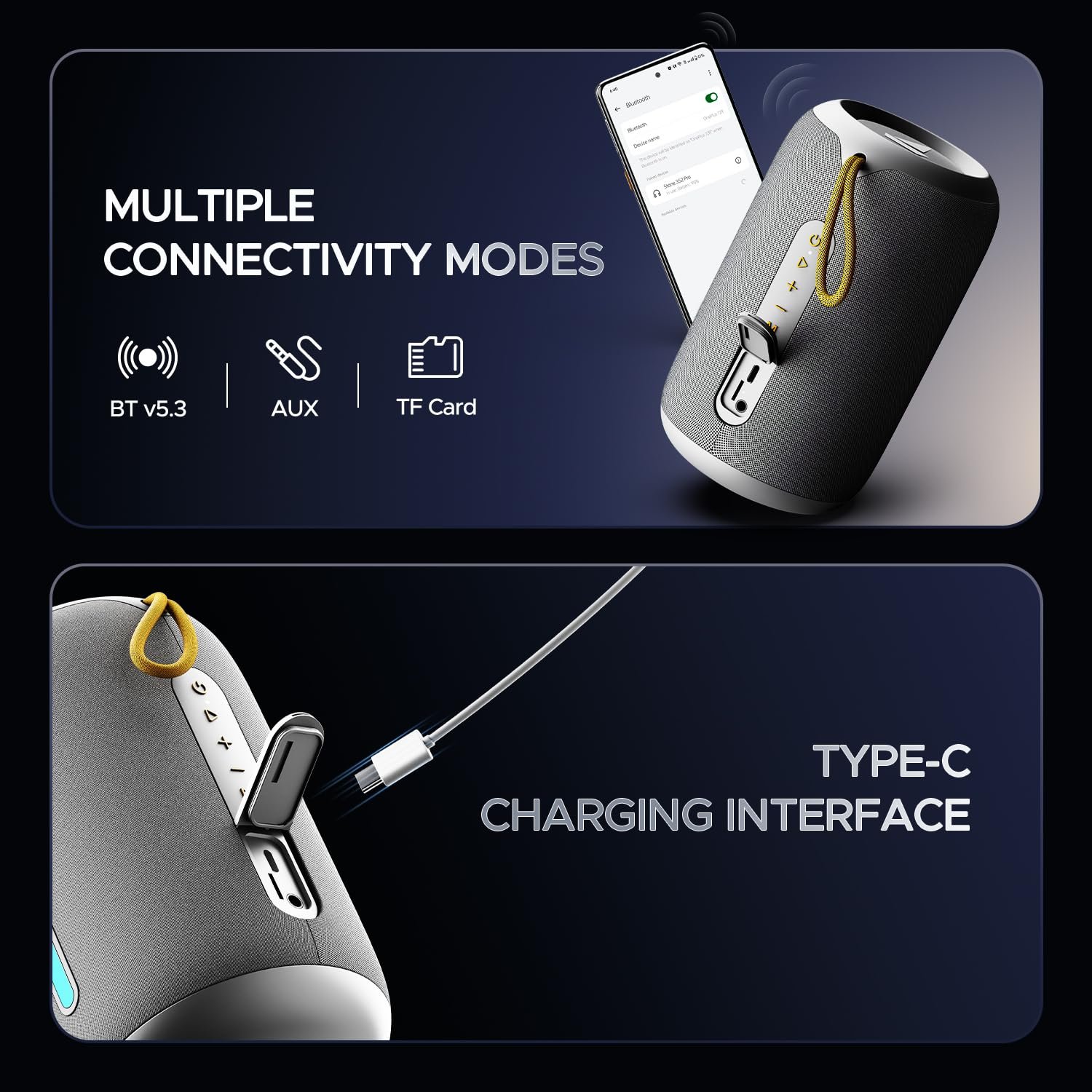 Type-C Charging Interface: Juice up your Stone 352 Pro speaker with rapid charging speed owing to its Type-C interface. Moreover, the Type-C interface ensures that you can charge this speaker without fumbling with the orientation.