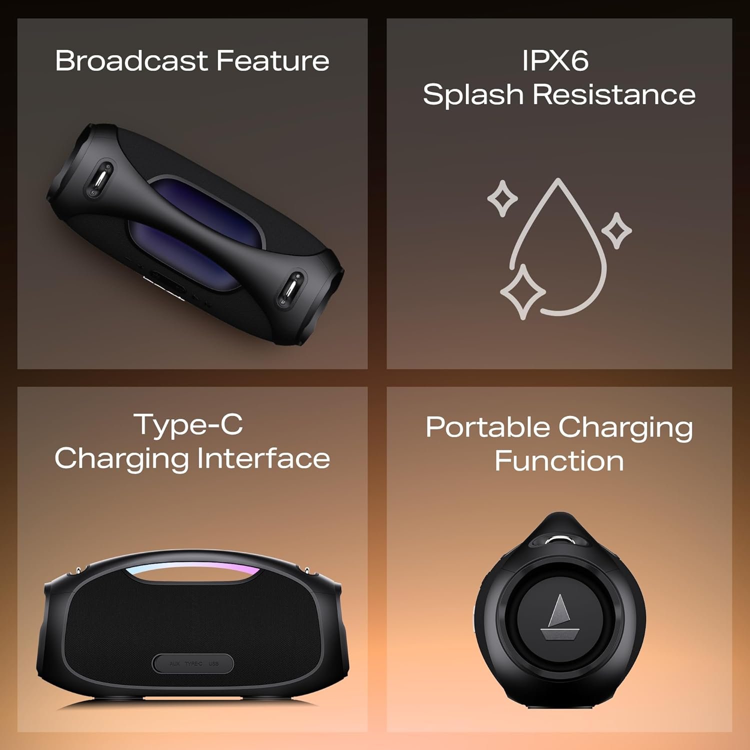 Seamless Connectivity: With Bluetooth v5.3, connecting your devices is a breeze, offering a stable and quick connection.;Rugged and Splash-Proof: The IPX6 Splash Resistance rating means the speaker can handle splashes and rain, making it ideal for outdoor use.