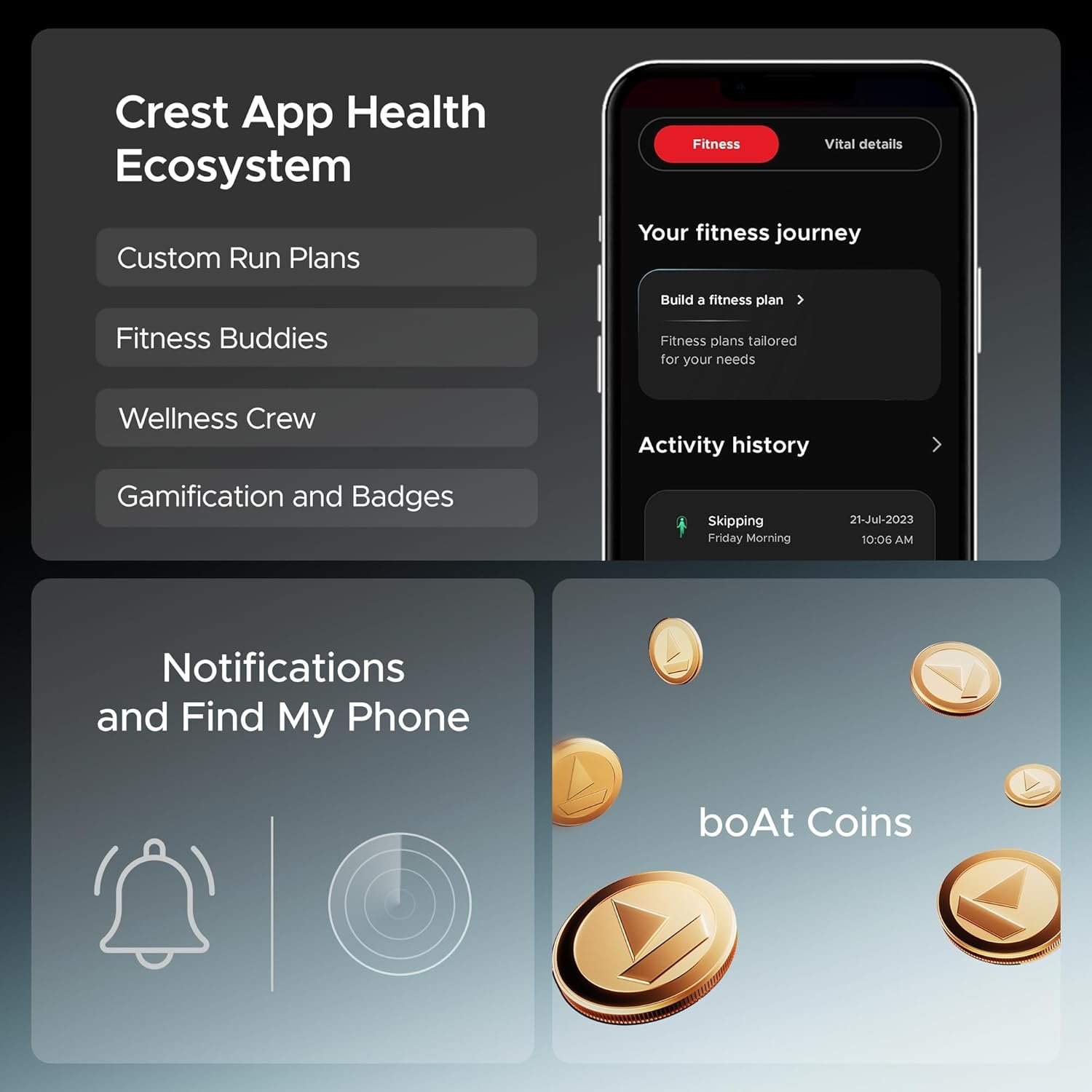 boAt Crest App Health Ecosystem: The boAt Crest app offers challenges, fitness plans, badges, and more to boost your fitness journey while using Wave Call 2 Plus. Join fellow challengers and collect boAt Coins in exchange for completing milestones.