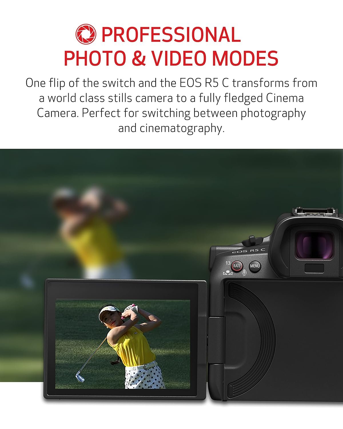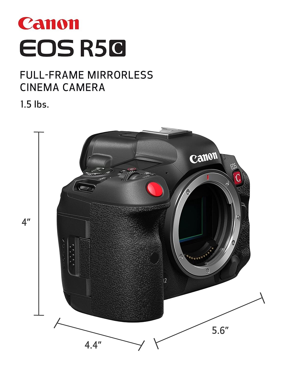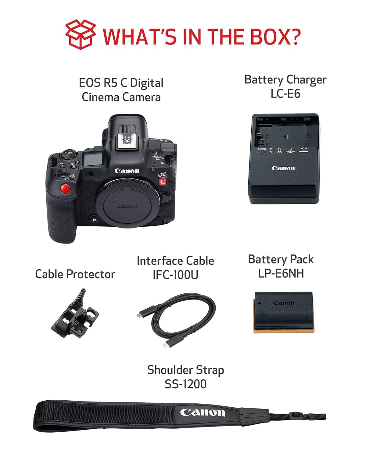 Compact and lightweight, the EOS R5 C is a true hybrid camera–a complete package that offers filmmakers, multimedia journalists, and advanced amateurs a cost-effective 8K, 4K, and FHD video camera for unlocking their creative potential. Boasting many of the video formats and features of the Cinema EOS lineup, the EOS R5 C features many of the still-photography capabilities of the EOS R5 camera in a lightweight, compact camera body that fits easily and comfortably in your hand. The EOS R5 C’s 45-Megapixel full-frame, CMOS imaging sensor is at the heart of the EOS R5 C camera’s superb image quality, which also powers impressive 8K/60P RAW cinematic video shooting and continuous capture speeds of up to 20 frames per second*, with Dual Pixel CMOS AF II capability that enables you to track split-second movements of fast-moving subjects. Advanced Eye, Face, and Head Detection AF with 1,053 Automatic AF zones makes it is easy to photograph people or intuitively track the whole body, face, or eye of cats, dogs, or birds using Animal Detection AF**. For those with the need for speed, Canon has also included vehicle subject detection for accurately tracking cars and motorcycles. Attach your lens to the camera body with ease using the RF compatible mount, plus capture crisp, clear, images of moving subjects any time, anywhere thanks to the EOS R5’s mechanical shutter speeds of up to 12 fps. What’s in the Box: EOS R5 C Digital Cinema Camera, Battery Pack LP-E6NH, Battery Charger LC-E6, Shoulder Strap SS-1200, Interface Cable IFC-100U, Cable Protector, and Camera Cover R-F-5.