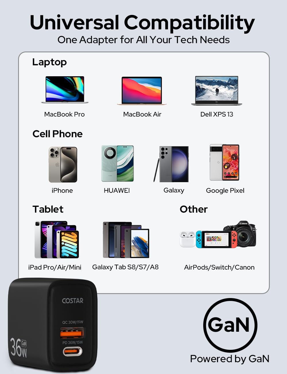 COSTAR 33W/35W/36W GaN Super Fast Charger, QC/PD Dual Port USB A + USB C Charger, Power Adapter Plug Wall Charger Charging Adaptor for iPhone, Mi,Samsung Galaxy, Oppo,Vivo,iQOO,Wide Compatibility