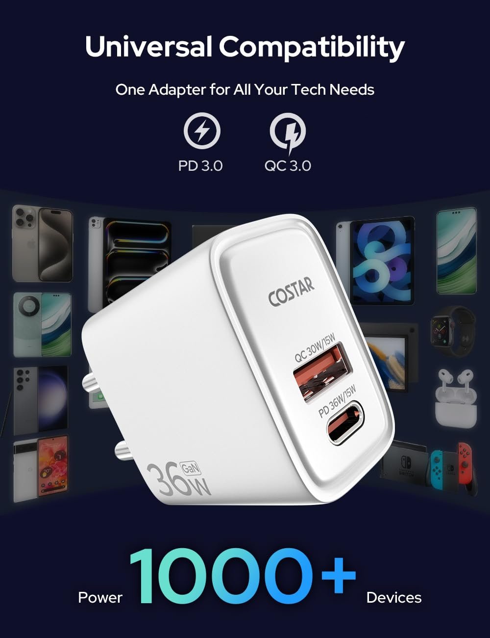 【Broad Compatibility, Universal Application】This little powerhouse is highly compatible, supporting all iPhone and Android fast charging protocols including QC3.0, PE2.0, PD3.0, FCP, AFC, BC1.2, and APPLE 2.4A. Perfect for a wide range of devices, including iPhone16/ 15/14/13/12/11/11 Pro/11 Pro Max/XS/XR/SE/X/8 Plus, AirPods Pro, iPad series, Galaxy S21/S20 series, Note20/Note10/S10/S9, Pixel series, Switch, and more.