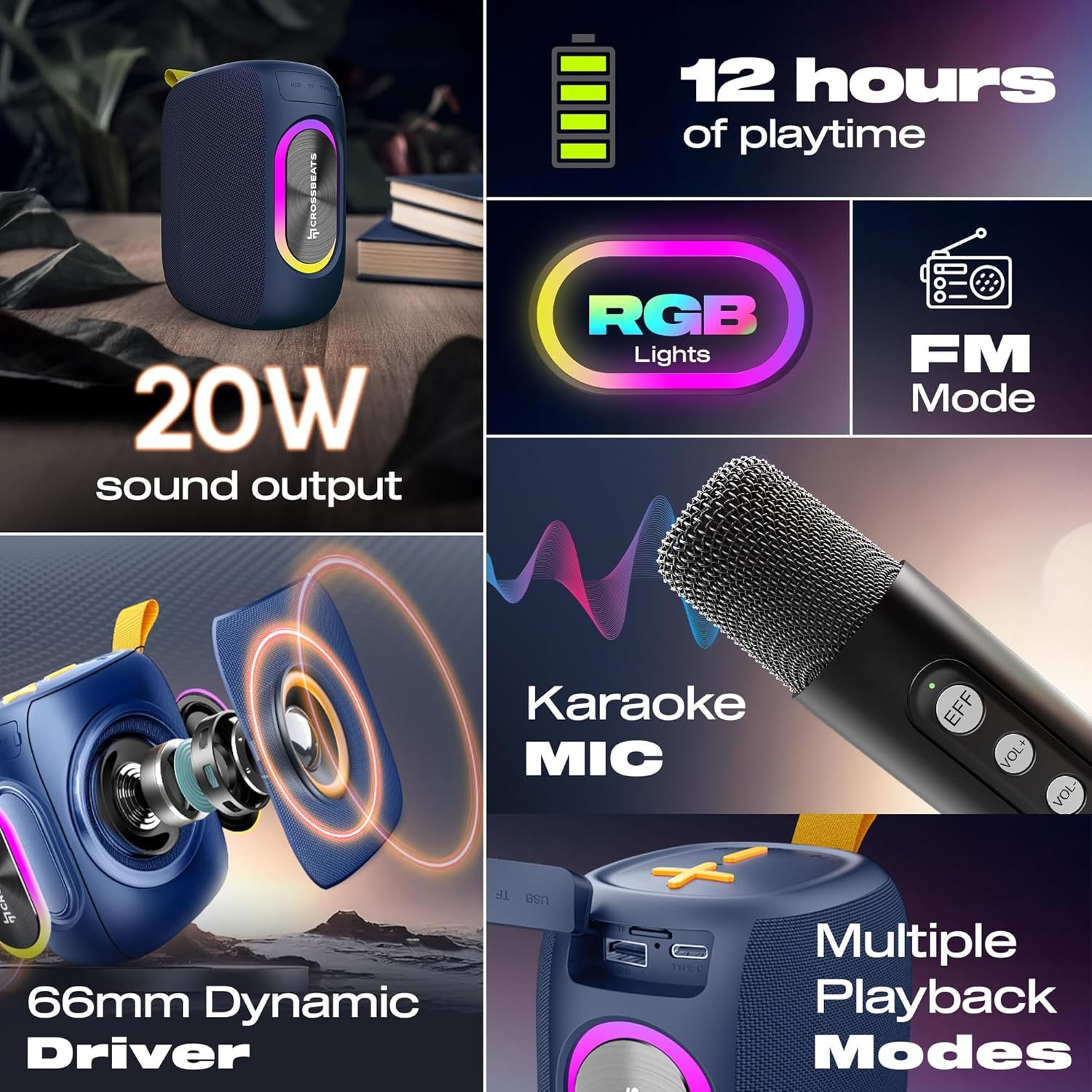 CrossBeats Newly launched Jam Box 20w Portable Bluetooth Speakers with Wireless Karaoke Mic,Gaming,RGB Lights,12H Play time, Bass, IPX5 Water Proof USB, SD Card,BT 5.4 mini Sound Box Speakers (Blue)