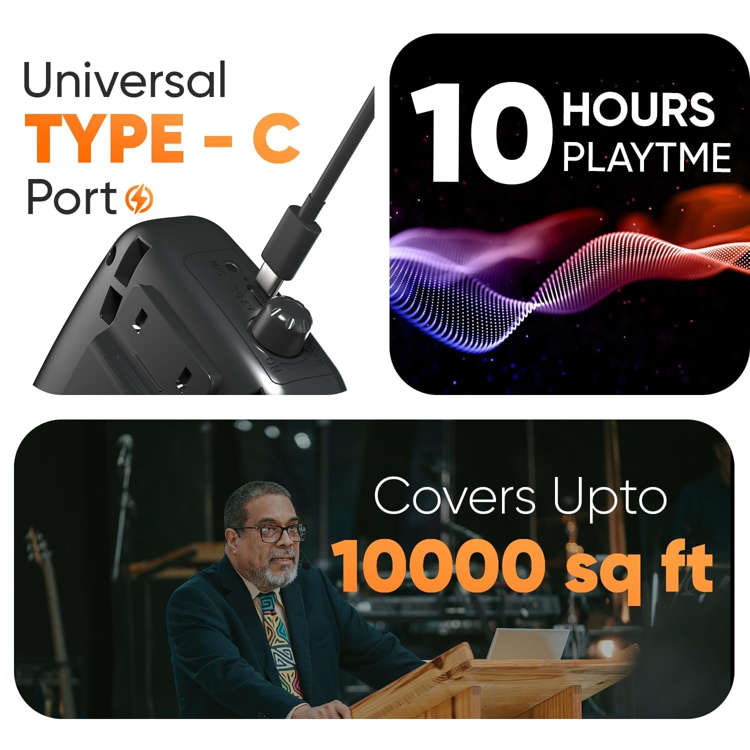 Type-C Charging & Extra Mic Port: Features a modern Type-C charging port for faster recharging and an additional mic input for dual-microphone use, enhancing versatility.