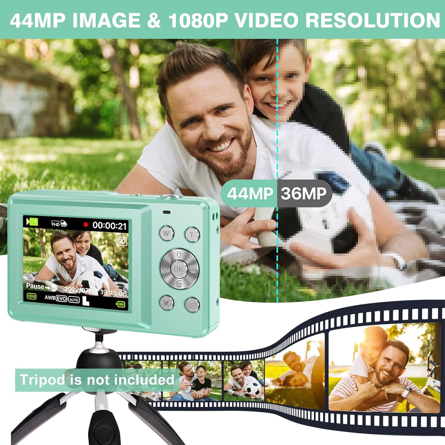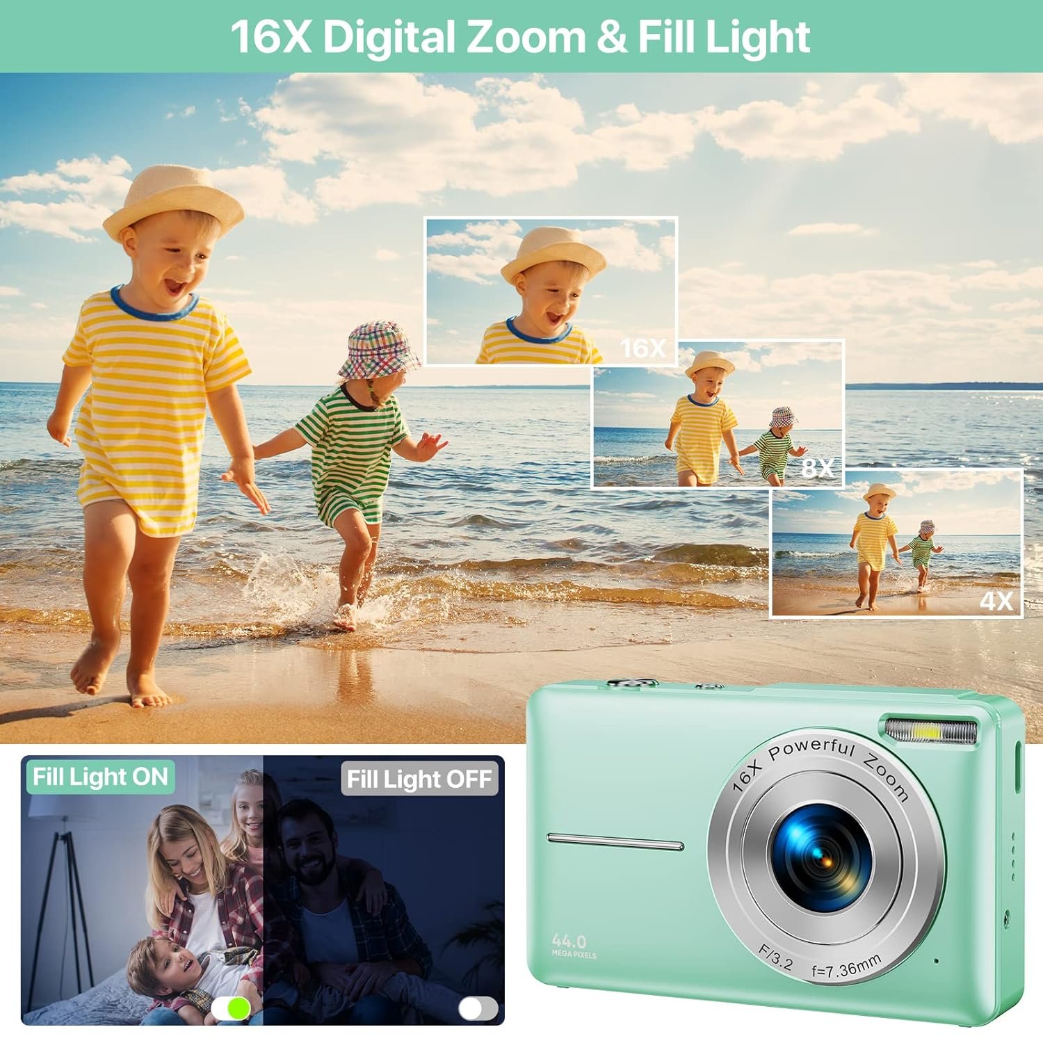 [1080P 44MP FHD Digital Camera] This kids camera featured with 1080P FHD video resolution,44MP (max) picture pixel, largely enhancing image clarity, compare with other kid cameras. This children mini camera supports 16X digital zoom, you can zoom in or out images by using the W/T button. The pause function allows you to pause when record or playback videos. And the built-in fill light helps you to take quality pictures in the dark.
