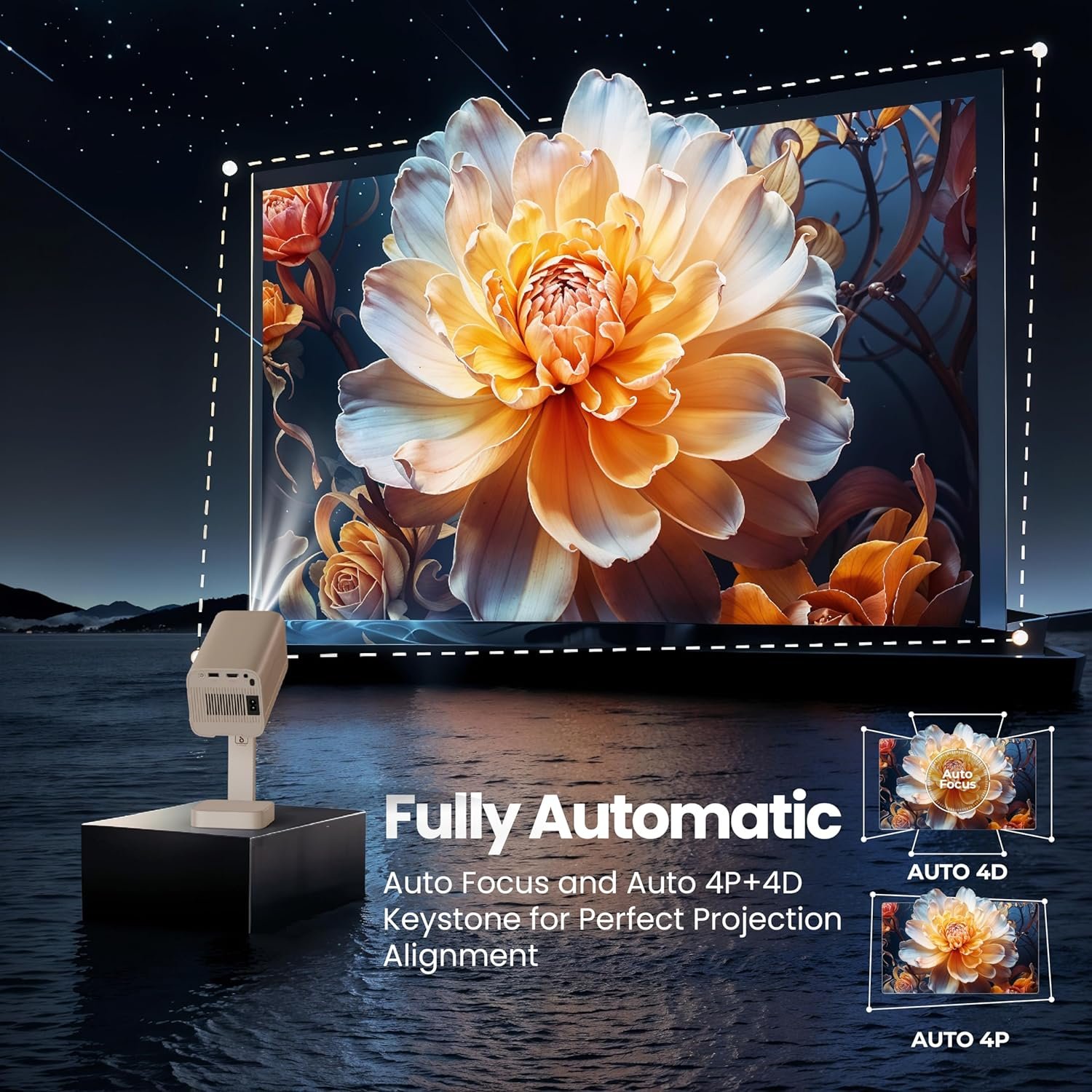 【Technology Re-Defined with AI Prowess & Bi-directional BT 5.4】 : Industry’s Best HiSilicon V252, with Quad Core Processor, ARM Cortex 431 GPU with 1GB-8GB | Dual Band Wifi6 (2.4+5 GHz) | Bi-Direction Bluetooth 5.4 | FULLY AUTOMATIC – the intutive AI powered auto focus and auto keystone projector along with dedicated remote button makes you in control always for razor sharp images | Auto Keystone with addition 4P and 6D (30° Horizontal + Vertical) electronic correction for corner to corner crystal clear projection.