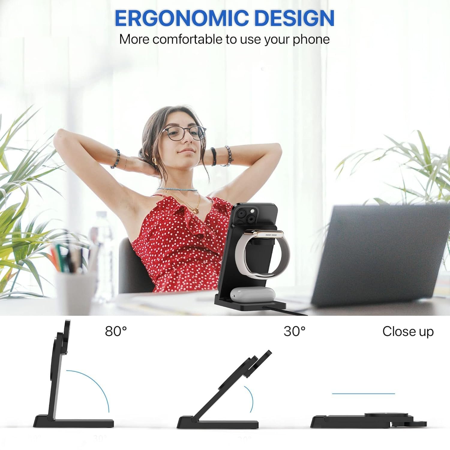 【Portable & Foldable Travel Charger Stand】The charging station is foldable, light and portable, and can be put in a bag or suitcase. This wireless charging pad is not only suitable for your home, office, if you are traveling or on a business trip, bring this 3in1 charger, which can charge multiple devices at once.